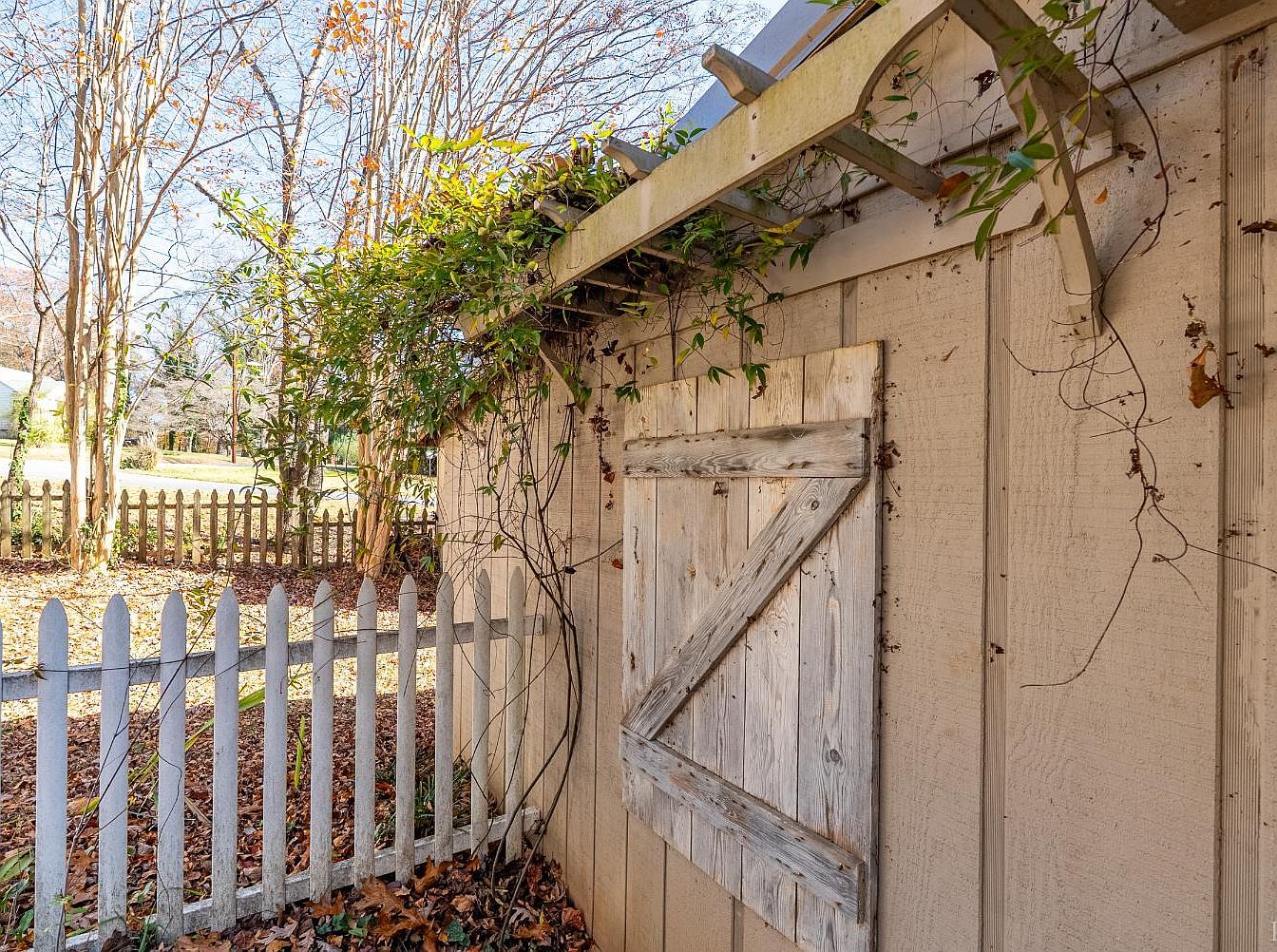 A rustic garden shed showcases weathered wooden siding, accented by an old barn-style door adorned with diagonal slats. Lush greenery spills from above, creeping along the roof and providing a natural touch against the textured wall. A quaint white picket fence encircles the yard, adding charm and framing the scene. The surrounding trees display a mix of bare branches and delicate seasonal foliage, casting dappled shadows on the ground. Soft golden leaves blanket the earth, hinting at autumn, while glimpses of an expansive lawn are visible beyond the fence, emphasizing a serene rural atmosphere.