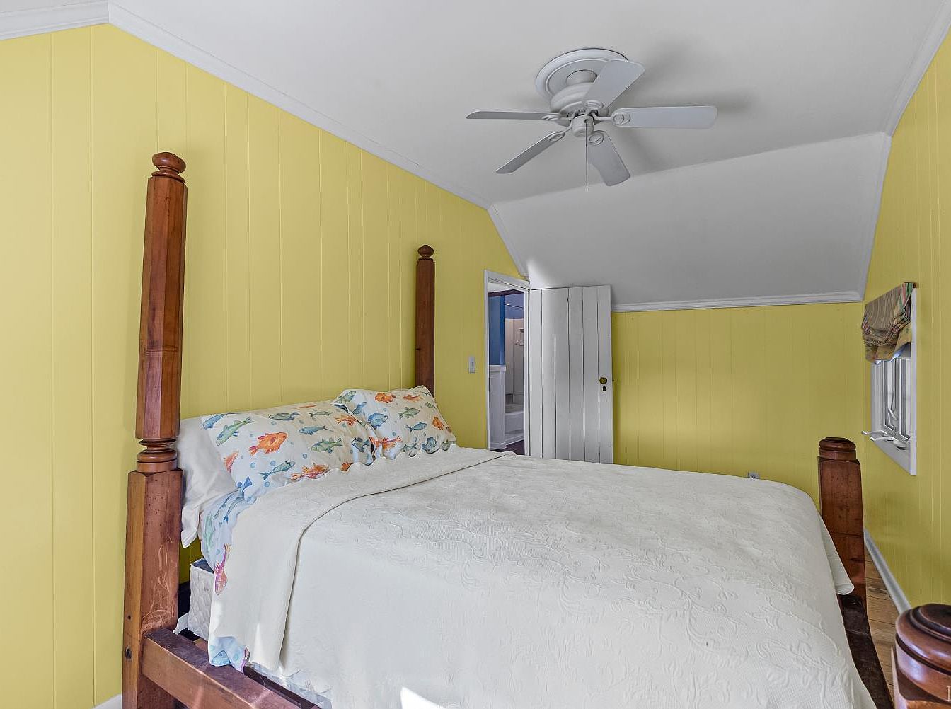 This cozy bedroom features vibrant yellow paneling that brightens the space, complemented by a sloped ceiling adding character. A sturdy wood bed frame with tall posts serves as the centerpiece, adorned with colorful pillows displaying aquatic themes. An inviting white bedspread seamlessly covers the mattress. Natural light filters through a small window adorned with a patterned valance, enhancing the cheerful atmosphere. The gentle breeze from a ceiling fan adds functionality while maintaining a relaxed ambiance. A concealed door hints at additional space, subtly integrating storage or a bathroom, creating a harmonious blend of comfort and utilitarian design.