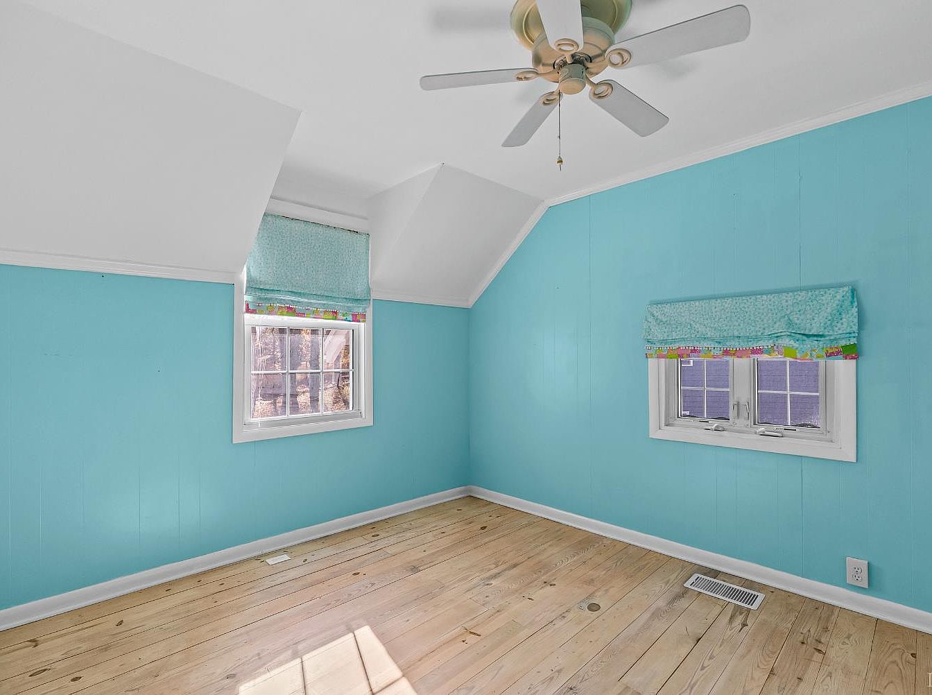 This bedroom features vibrant turquoise walls that create a cheerful atmosphere. The ceiling is sloped, enhancing the cozy feel of the space. Two windows are dressed with light blue curtains that speckle colorful trims, allowing natural light to filter through. The floor is made of warm, polished wooden planks, adding a rustic charm. A central ceiling fan circulates air, contributing to comfort. The minimalist aesthetic is elevated by the absence of heavy furniture, providing ample open space, which encourages versatility for arrangements, making it ideal for restful relaxation or playful endeavors.