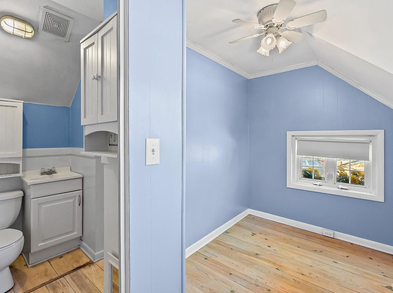 This bathroom area features a soft blue color palette that creates a tranquil atmosphere. The walls are partially paneled with light blue siding, enhanced by white trim elements. A compact white cabinet stands above a small vanity with a minuscule sink, maximizing space while adding storage. The ceiling is fitted with a simple white fan, providing functionality and comfort. Natural light streams through a quaint window dressed with a white blind, illuminating the polished wooden floor. The sloped ceiling adds a cozy charm, while the overall design embodies a modern yet classic aesthetic, suitable for relaxed living.