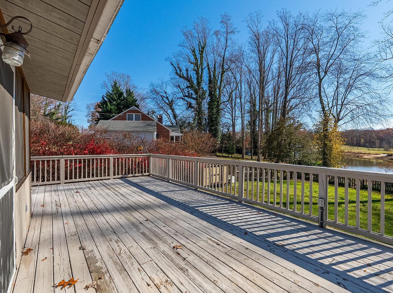 This image captures the expansive backyard featuring a charming two-story home with a large, inviting deck. The deck is constructed of wood, providing ample space for outdoor furniture. The home has a pale beige exterior, adorned with dark shingles and white window frames, creating a classic aesthetic. Lush green grass fills the yard, dotted with fallen leaves, indicating the autumn season. Surrounding the area are tall trees, their branches bare, adding a rustic touch. The shadow of a nearby tree stretches across the lawn, enhancing the tranquil atmosphere of this outdoor space.