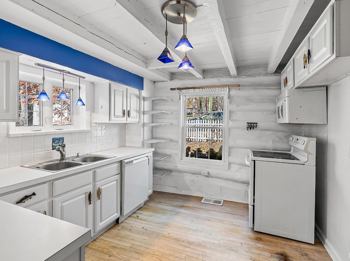 This kitchen features a spacious layout with a bright, airy feel. White cabinetry provides a clean contrast against the natural wooden floor. A dual sink, positioned under a window, allows for ample natural light to enhance the workspace. Blue pendant lights hang from the ceiling, drawing attention with their unique geometric design. Open shelving alongside the window creates an opportunity for decorative displays or easy access to frequently used items. The walls exhibit a rustic charm with a whitewashed finish, and the overall color scheme of white and blue accentuates a modern yet cozy aesthetic, ideal for casual gatherings.