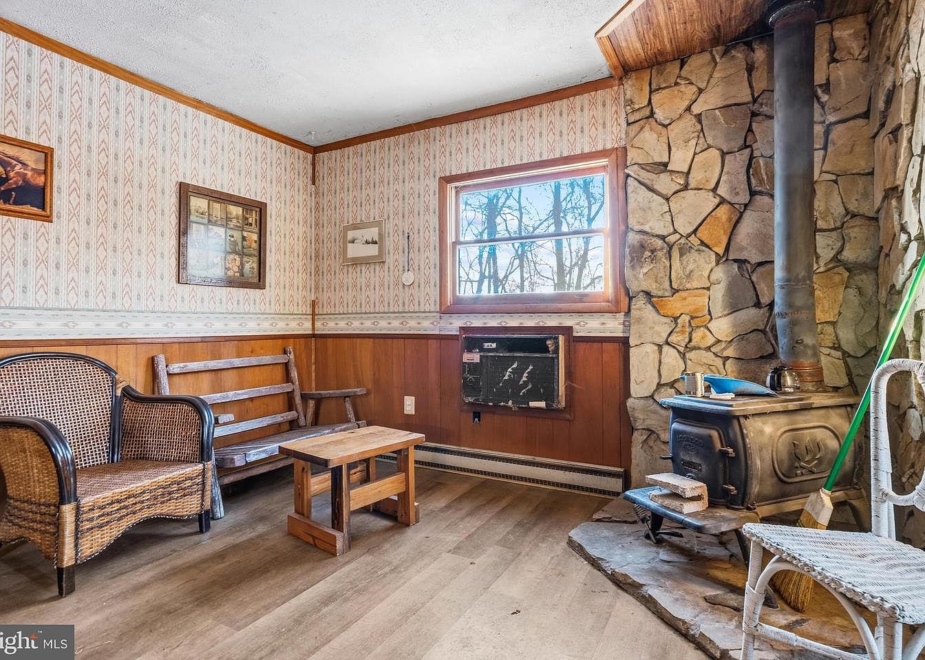 This cozy den features rustic and traditional elements, showcasing wood paneling in warm brown tones. The wall behind the chairs is adorned with vintage wallpaper, patterned in subtle pastels. A sturdy wooden coffee table anchors the room, surrounded by woven seating that includes a rounded chair and a simple slatted bench. Natural light floods through a large window, illuminating the corner where a stone fireplace stands, adorned with a black metal wood stove. Accents like framed art pieces and a radiator add character, alongside a hint of modernity with an air conditioning unit subtly integrated into the wall.
