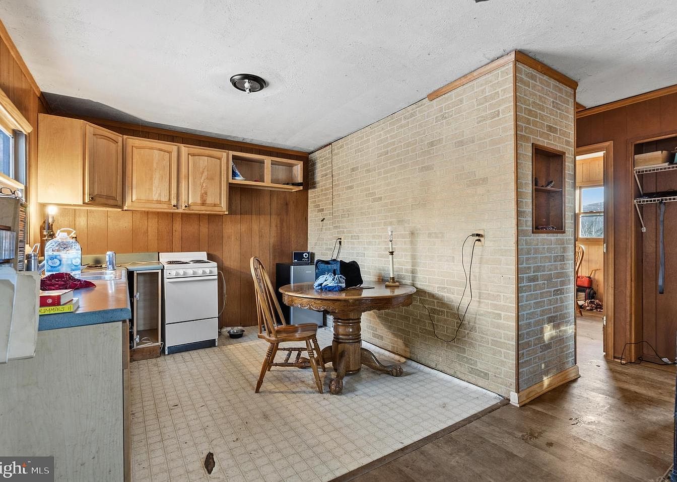 This kitchen features a simple yet functional layout with wooden cabinetry and a beige brick accent wall. Light wood tones dominate the cabinetry, providing warmth, while the stove and refrigerator are positioned conveniently for cooking. A round dining table with a decorative pedestal base sits center, surrounded by wooden chairs. The floor displays a patterned linoleum, contributing a vintage touch to the space. Natural light filters in through windows, illuminating kitchen surfaces. Objects such as a water bottle and folded clothes add a lived-in feel, hinting at daily use. The overall aesthetic balances rustic charm with practicality.