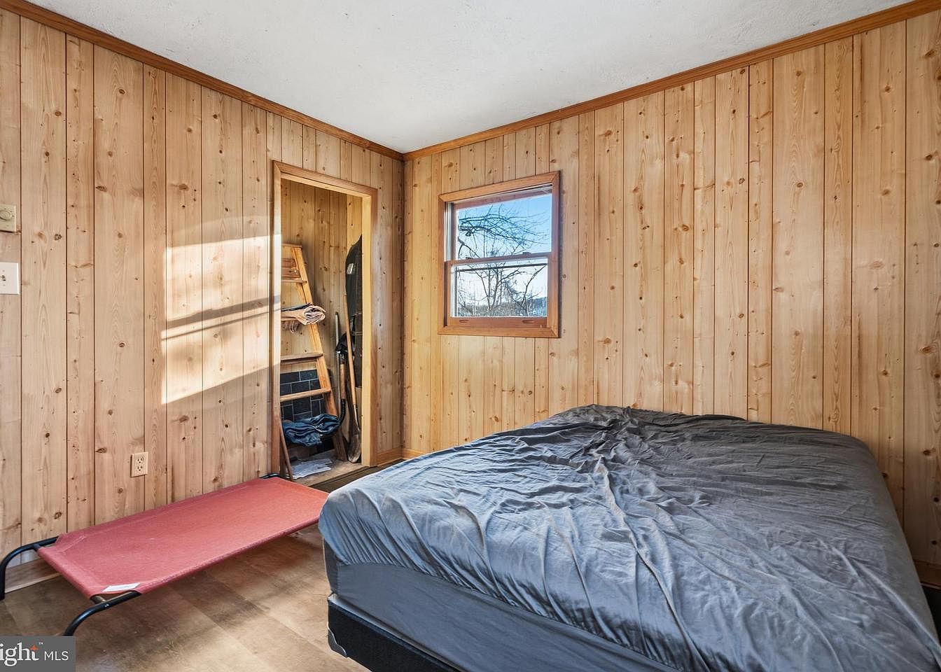 This cozy bedroom features warm, rustic aesthetics with wooden paneling across the walls. The natural wood grain adds a vintage charm, enhanced by a subtle sheen from sunlight filtering through a double-hung window. A black bed with a wrinkled gray blanket occupies the room, complemented by a simple red folding cot positioned nearby. An open doorway reveals a compact storage area, displaying clothing and tools on a wooden rack. The floor is a smooth, natural tone, lending an inviting ambiance that emphasizes simplicity and comfort, ideal for a tranquil retreat.