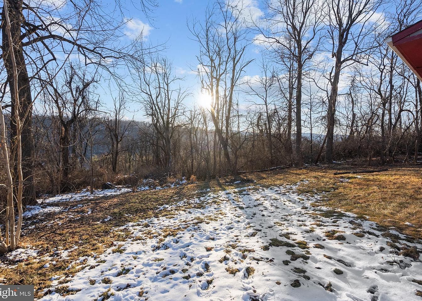 A serene backyard reveals a blend of nature and open space, featuring a mix of bare trees and patches of snow covering the ground. The central area consists of grassy patches interspersed with remnants of winter snow, indicating a transition to spring. Sunlight filters through the branches, casting long shadows on the ground. A soft blue sky with scattered clouds adds to the peaceful atmosphere, while distant hills provide a scenic backdrop. The space invites tranquility, perfect for gatherings or personal reflection, reflecting a harmonious connection with the natural surroundings.