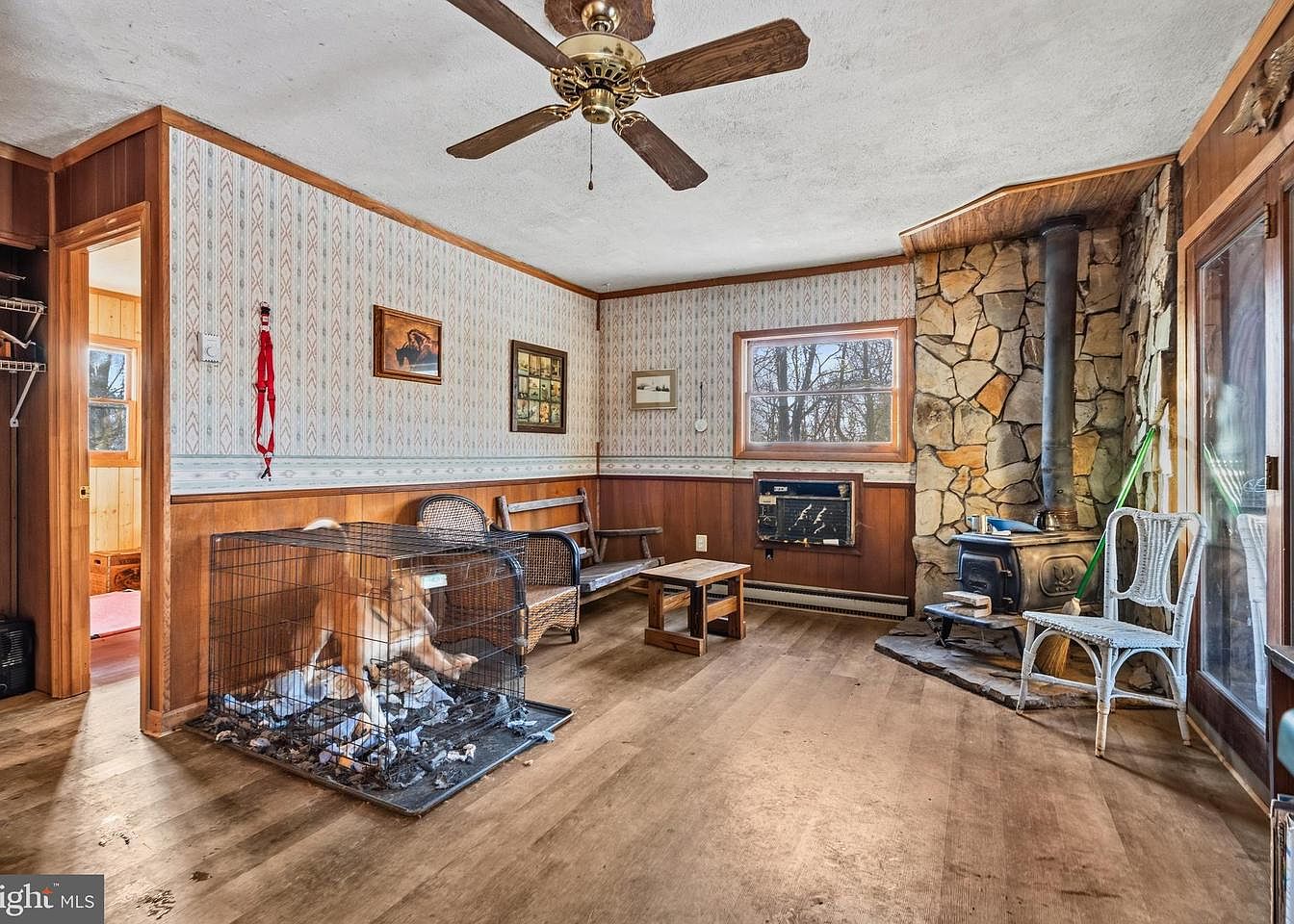 The living room features a cozy layout with a blend of warm wood accents and vintage decor. The walls are adorned with patterned wallpaper, complemented by rustic wood paneling at the lower half. A built-in wood stove in a stone hearth serves as a focal point, while light flows in through a large window, enhancing the inviting atmosphere. A small, simple wooden table sits in the center, surrounded by a couple of vintage chairs. A dog crate with debris rests on the floor, adding a touch of homeliness. Overall, the room emanates a charming, lived-in vibe with nostalgic elements.