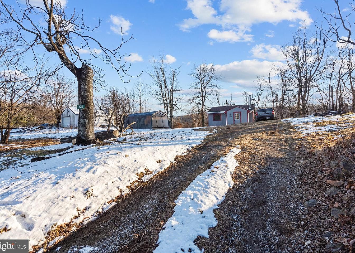 A gravel driveway winds gently uphill, flanked by patches of snowy ground contrasting with exposed earth. To the right, a rustic structure with a vibrant red facade features a welcoming door framed in white, hinting at a quaint and inviting outdoor atmosphere. Sparse trees, some bare of leaves, reach towards a clear blue sky lightly scattered with clouds, adding a serene natural backdrop. In the distance, a well-maintained greenhouse stands, partially covered in snow, showcasing the potential for gardening. The scene exudes a peaceful rural charm, reflecting both the beauty of nature and the simplicity of country life.