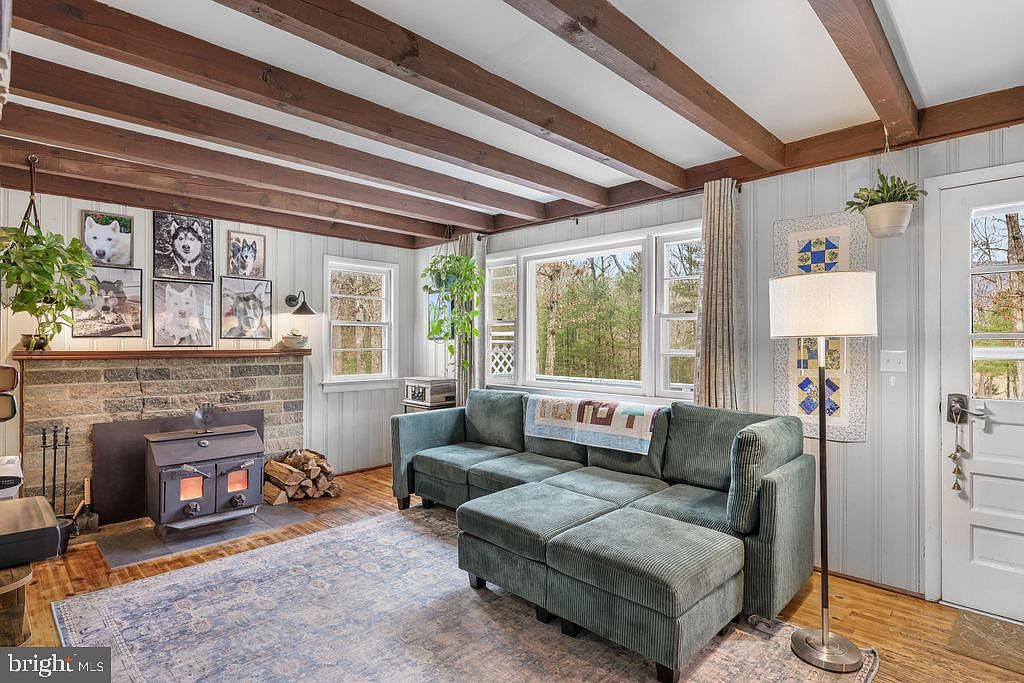 This cozy living room features a blend of rustic and modern elements. Exposed wooden beams grace the ceiling, enhancing the warm and inviting atmosphere. A stone fireplace stands as a focal point, paired with a sleek, black wood stove. A plush, sectional couch in a deep teal hue complements the soft, patterned area rug beneath. Natural light floods through multiple windows, framed by soft curtains that accentuate the space. Artwork showcasing playful pet portraits adds character to the walls. Indoor plants bring a touch of nature, while a standing lamp casts a warm glow, perfect for relaxed evenings.
