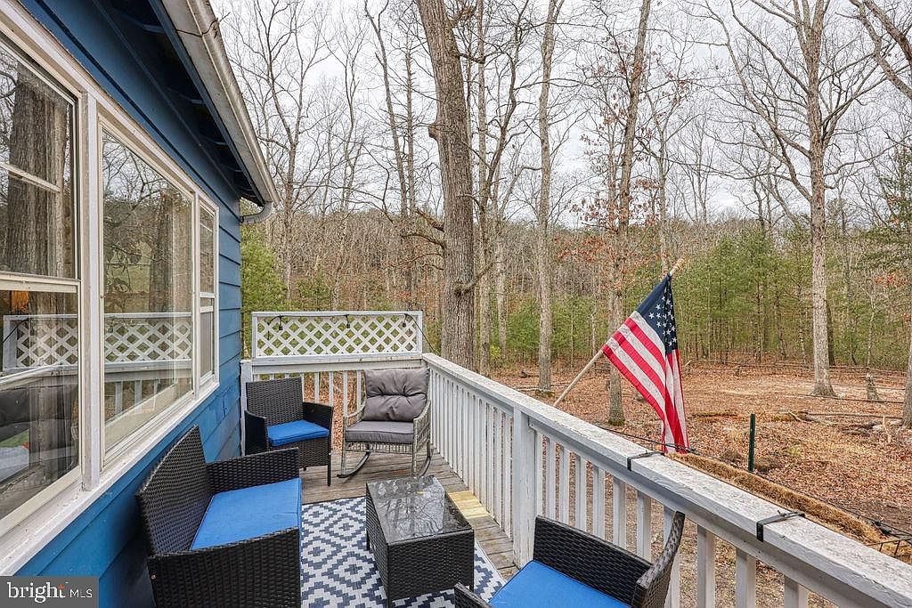 The outdoor deck features bright blue siding that adds a cheerful vibe to the space. Wooden flooring complements the color while providing a warm, rustic feel. Two stylish metal-framed chairs with mesh fabric sit near a small table, perfect for casual gatherings. An inviting seating area with dark wicker chairs and a coffee table enhances comfort, ideal for relaxation. The deck railing showcases a simple white design, providing a clean contrast to the blue walls. A small American flag flutters nearby, adding character to the natural backdrop of surrounding trees, emphasizing an open, inviting atmosphere.