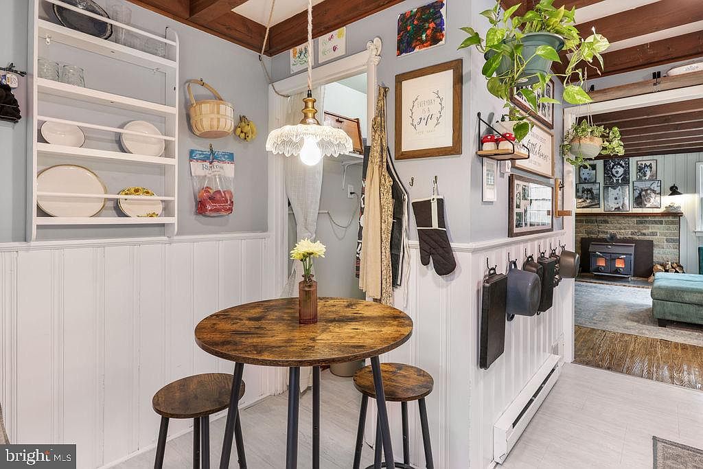 This cozy dining nook features rustic charm with a small wooden round table accompanied by two stools. The space is illuminated by a vintage pendant light hanging from a beamed ceiling, enhancing warmth. Light gray walls provide a soft backdrop to white shiplap wainscoting, creating a welcoming vibe. Open shelving displays plates and adds a decorative touch to the wall, alongside various framed art. A couple of potted plants infuse life into the atmosphere. Adjacent spaces reveal a glimpse of a living room with a fireplace, suggesting a seamless flow between dining and relaxation areas.
