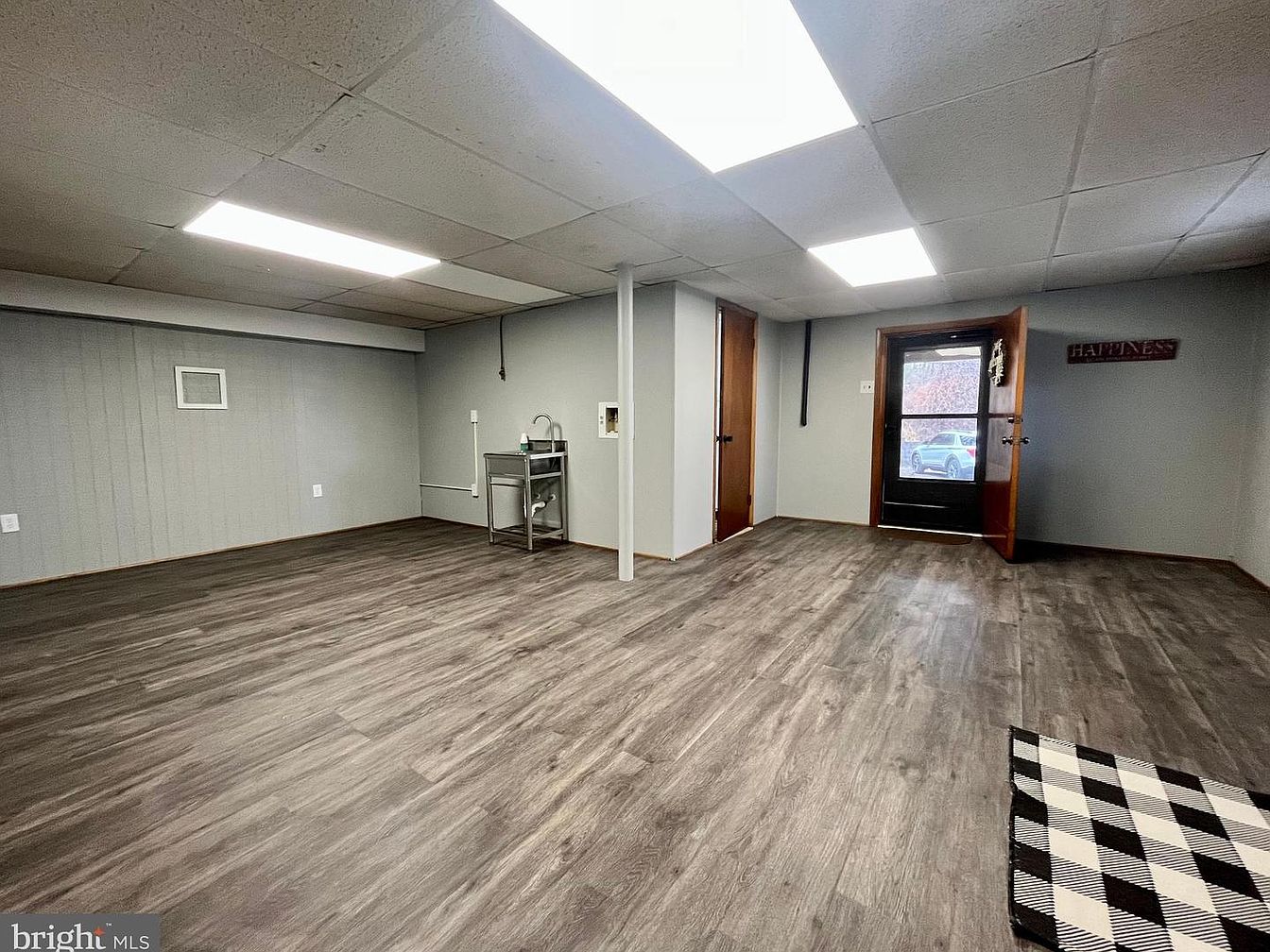 This basement area features a spacious layout with a light wood-like vinyl floor that enhances the bright atmosphere. The walls are painted a soft gray, creating a neutral backdrop suitable for various uses. Above, a grid ceiling with fluorescent lights provides ample illumination. To the left, a small utility sink and countertop suggest functionality, making it ideal for laundry or craft activities. Two wooden doors on the right lead outside, with one door adorned with a ‘Happiness’ sign, adding a personal touch. A black and white checkered rug lends a hint of style, enhancing the cozy feeling.