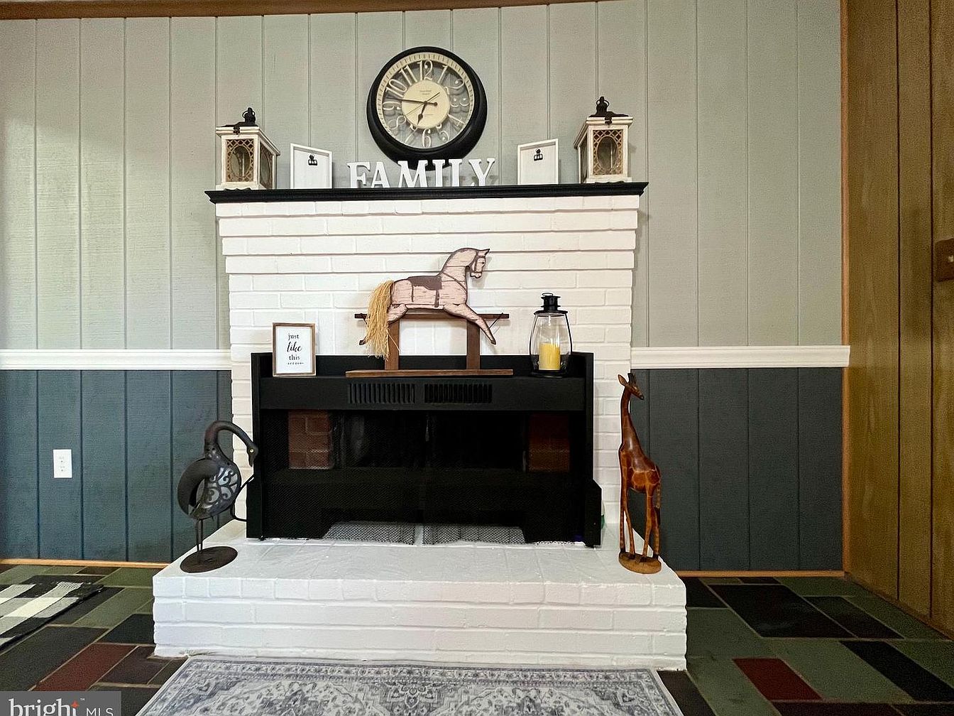 This living room features a cozy fireplace made of white brick, crowned by a large wall clock and decorative items such as lanterns and wooden accents. The ‘FAMILY’ sign is prominently displayed, adding a personal touch. The walls showcase a dual color scheme of light gray and dark blue panels, creating a charming contrast. The floor is adorned with an array of colorful tiles, enhancing the room’s rustic appeal. Unique decor includes a wooden horse and a giraffe statue, adding character. A delicate rug lays in front of the fireplace, inviting warmth and comfort. Beautifully integrated elements reflect a welcoming atmosphere.
