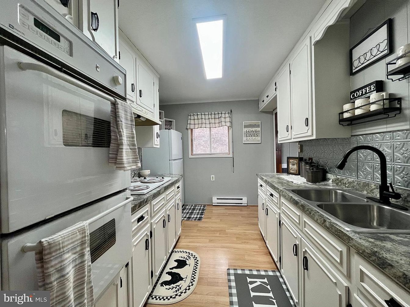 This kitchen showcases a functional and inviting layout with white cabinetry and a gray color scheme. The countertops, featuring a dark granite finish, contrast beautifully against the cabinetry. Clean lines are emphasized by the hardware in matte black. A dual-sink setup sits by the window, allowing natural light to flood the space, enhanced by a skylight overhead. Decorative elements include a minimalist coffee rack and cozy wall art that add warmth. Black-and-white checkered mats and a playful rug with a chicken motif introduce character, making this kitchen both stylish and practical for everyday use.