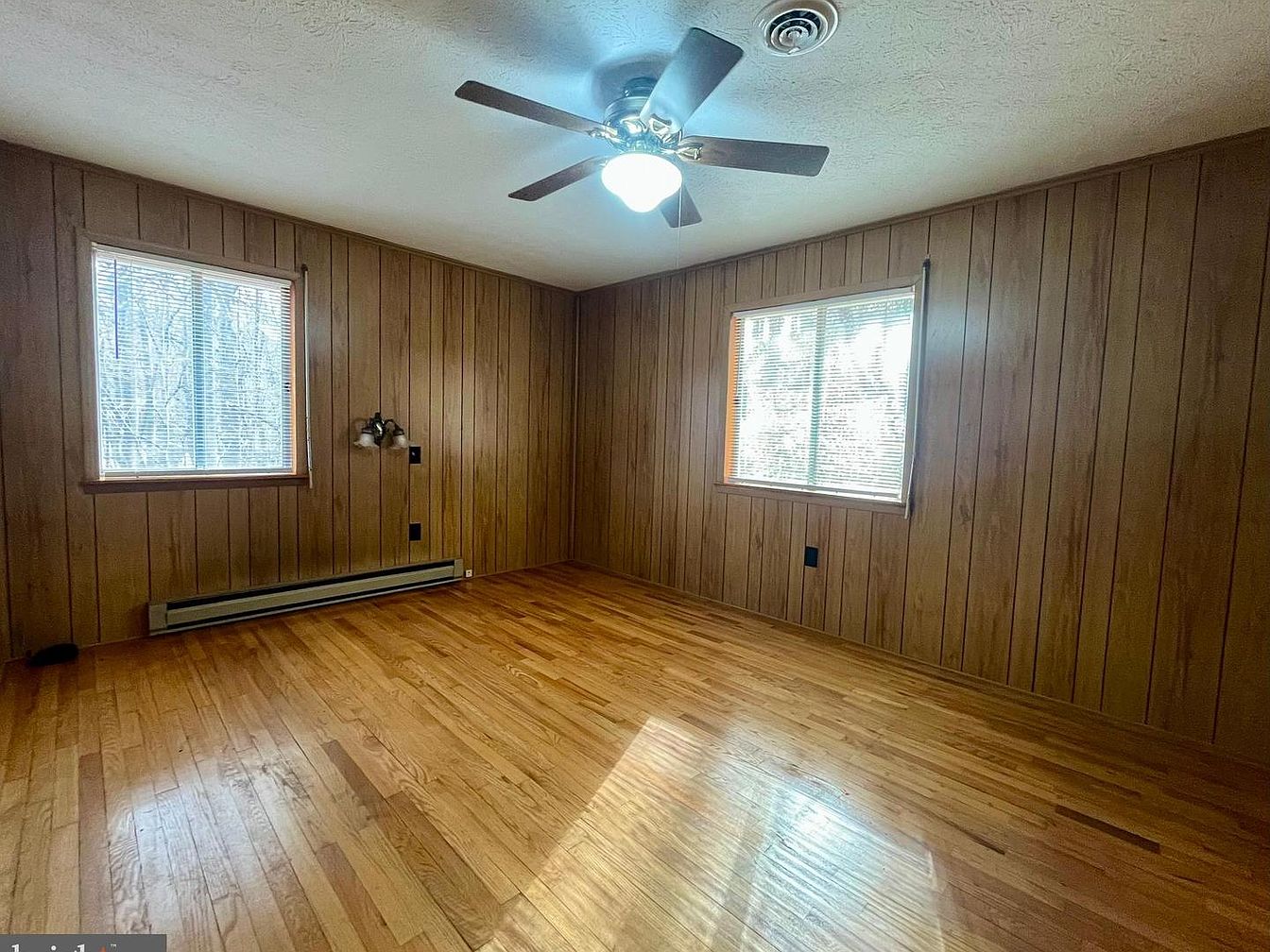 This cozy bedroom features rich wooden paneling that enhances its warmth and charm. Natural light pours in through two large windows, complemented by classic blinds. The ceiling showcases a simple design, equipped with a ceiling fan that adds functionality. The hardwood flooring, with its golden hues, contrasts beautifully with the darker tones of the walls, creating a harmonious atmosphere. An electric baseboard heater runs along one wall, providing warmth during cooler months. The clean lines and minimalistic approach of the space highlight a rustic yet inviting aesthetic, perfect for relaxation.
