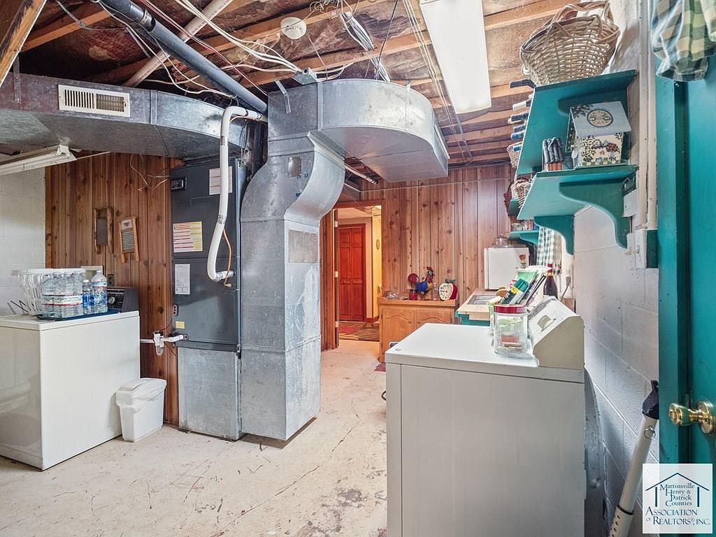 This basement area features a functional, utilitarian layout with a blend of practical elements. The walls are partially clad in warm wooden paneling, contrasting the white concrete sections. A prominent HVAC unit stands beside a standard washing machine, creating a domestic working environment. Above, exposed beams and wiring highlight the raw architecture of the space. Shelves painted a deep teal offer vibrant storage against the wood tones, adorned with baskets and household items. Fluorescent lighting ensures bright visibility, enhancing the basement’s practicality while maintaining a cozy, lived-in feel that reflects its historical roots.
