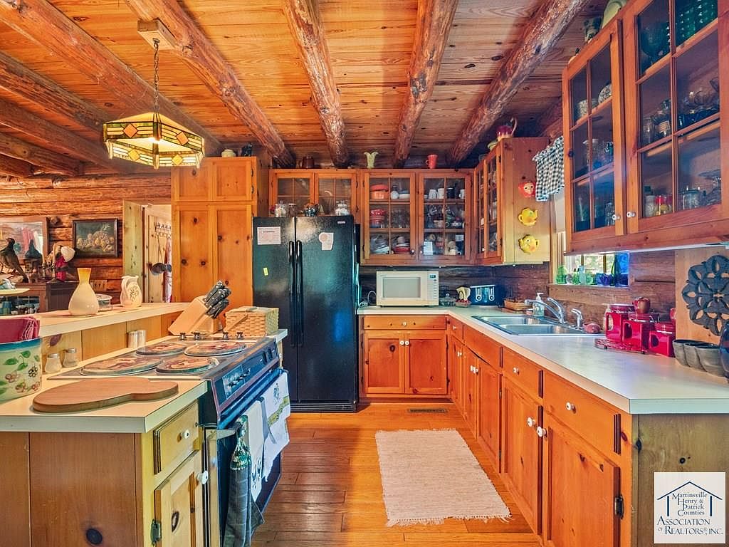 A rustic kitchen with warm wooden tones, featuring log cabin walls and exposed beams. The cabinets, made of honey-colored wood, showcase a variety of colorful dishware, contributing to a homey atmosphere. The countertops are light, contrasting with the darker cabinetry. A black refrigerator stands against one wall, complemented by a microwave and a stove that have a vintage charm. The pendant light adds a decorative touch, with its stained glass casting a soft glow. A small rug lies in the center, and various utensils and decorative items are neatly arranged, enhancing the kitchen’s cozy aesthetic.