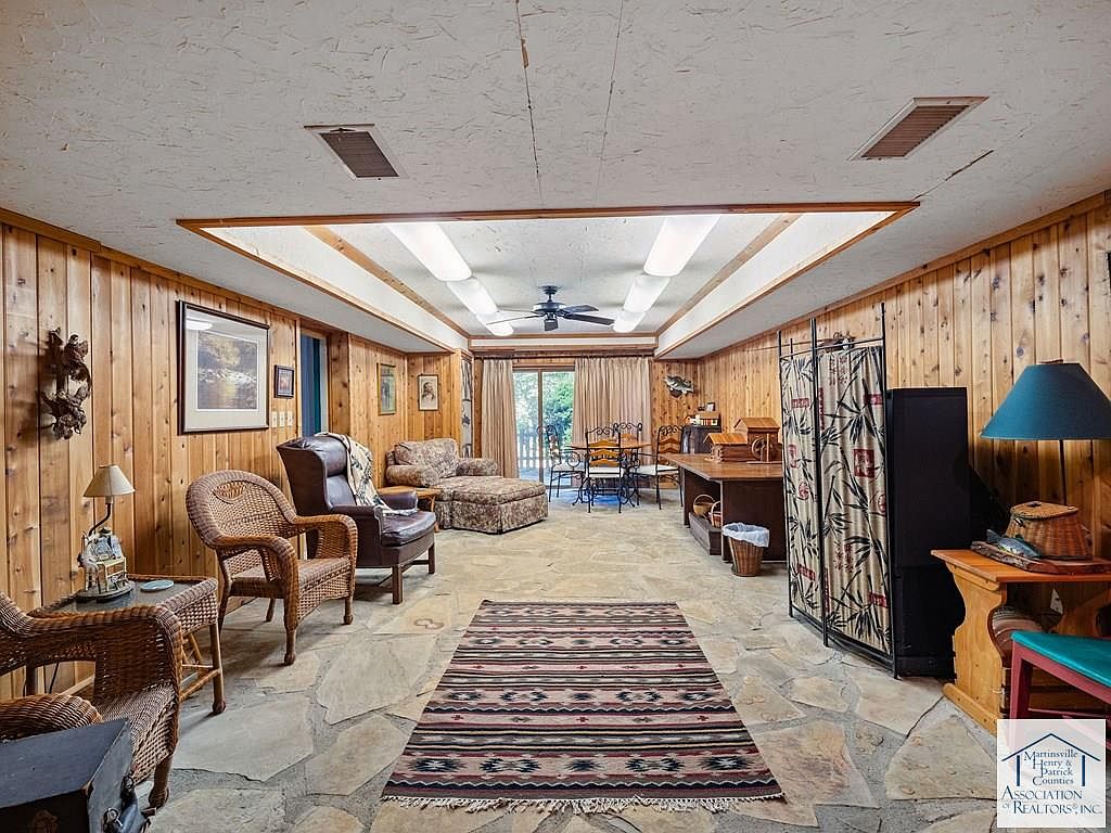 This family room features warm wooden walls and a unique stone floor, creating a cozy ambiance. Natural light streams in from the large sliding glass doors, which open to an outdoor area. Furniture includes woven chairs and a plush sofa, providing ample seating. A large area rug with a geometric pattern adds color and texture, contrasting nicely with the stone. Decor includes framed artwork on the walls and a stylish lamp beside a side table. A ceiling fan circulates air, while a small dining set in the background enhances the multifunctional space, perfect for gatherings.