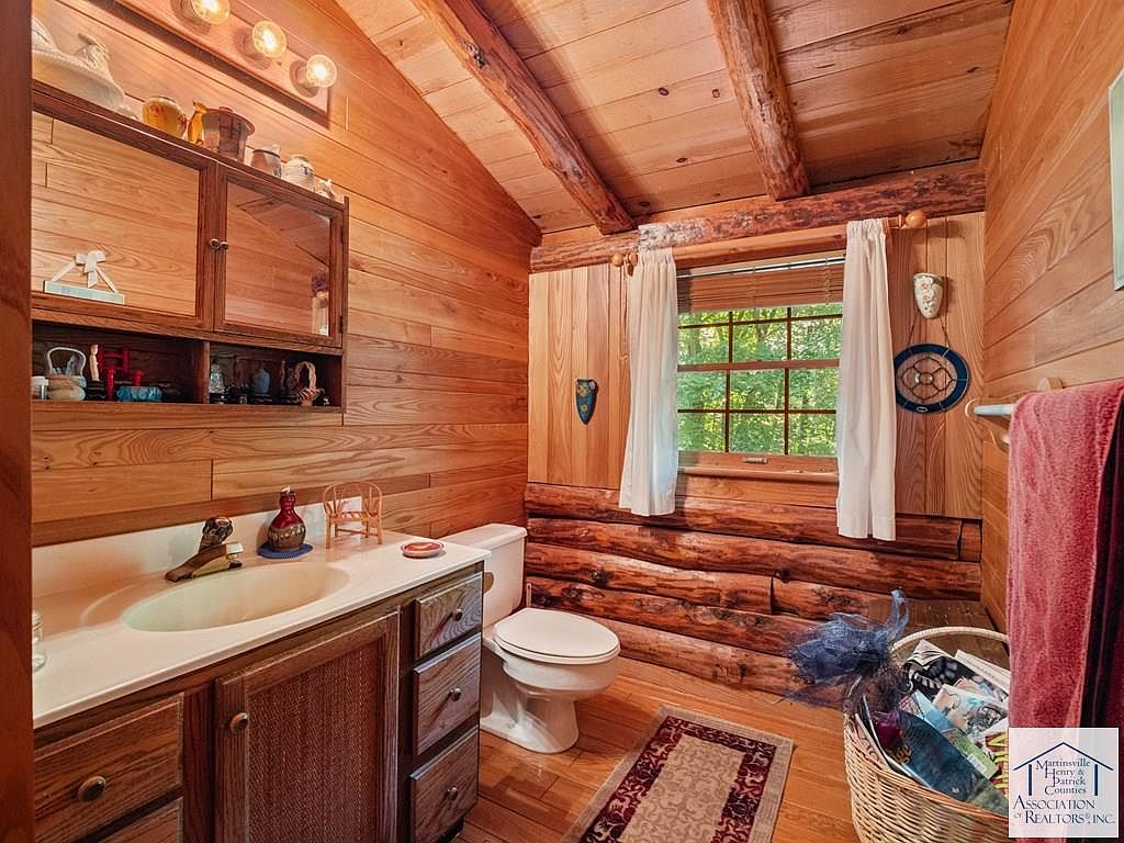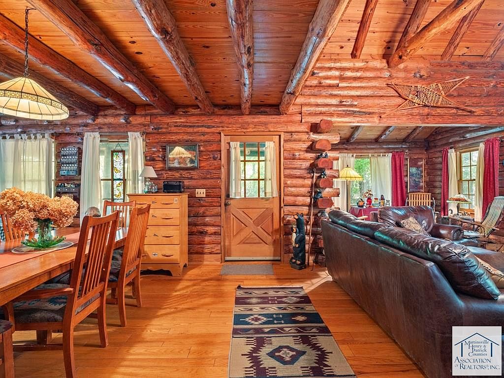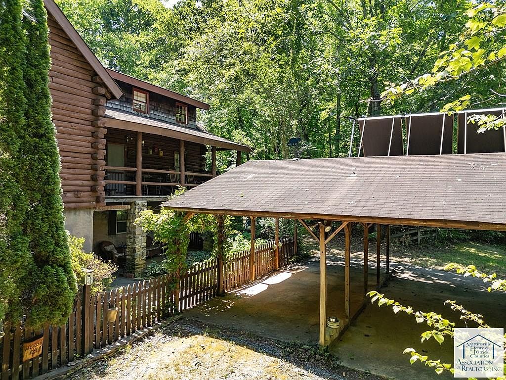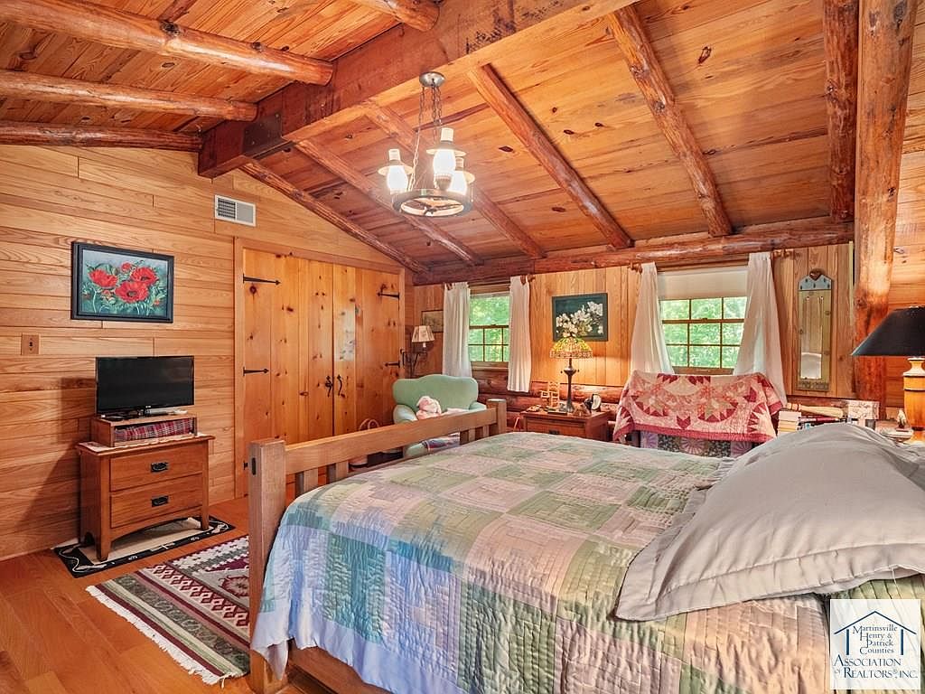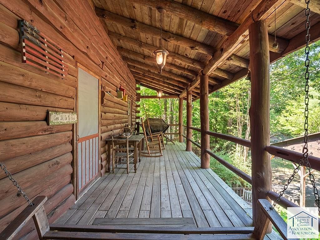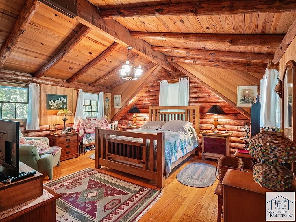Nestled on 5 acres in Patrick Springs, VA, this charming cabin, listed at $350,000, offers a serene escape with historical significance as a local retreat. Built in the early 20th century, its rustic log architecture showcases cathedral ceilings and hardwood floors, enhancing the warm ambiance. The cabin features three levels, each with a bedroom and full bath, accommodating ample privacy. Recent renovations include a new roof and eco-friendly solar panels, alongside a cozy wood stove and a rock fireplace for winter warmth. Additional amenities comprise a screened gazebo, a mother-in-law suite, and a secret room in the basement, making it a unique, functional retreat perfect for families or investment opportunities.