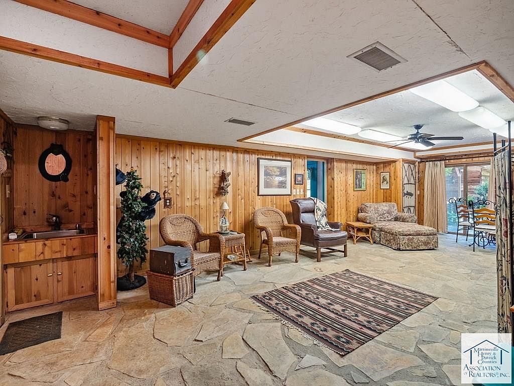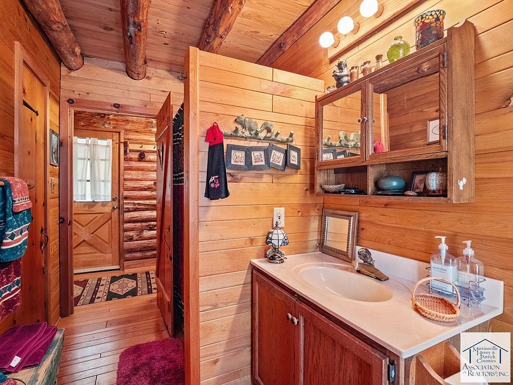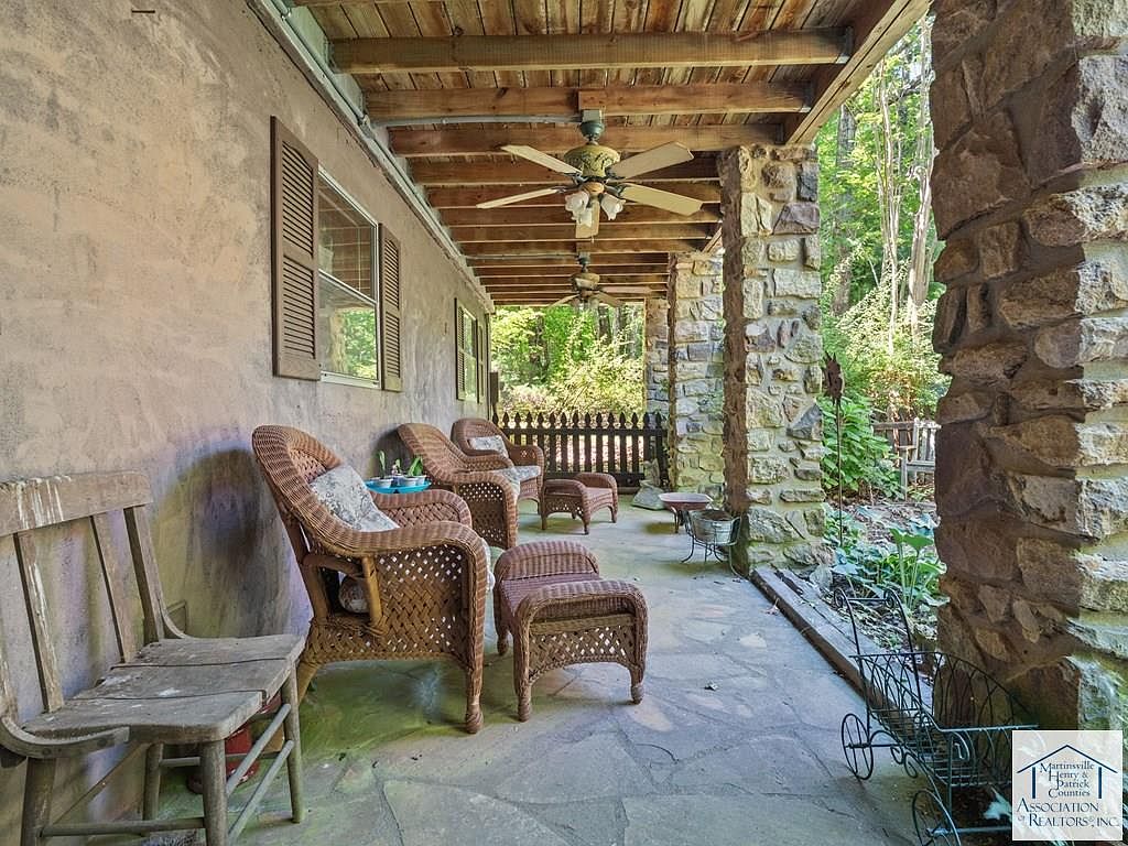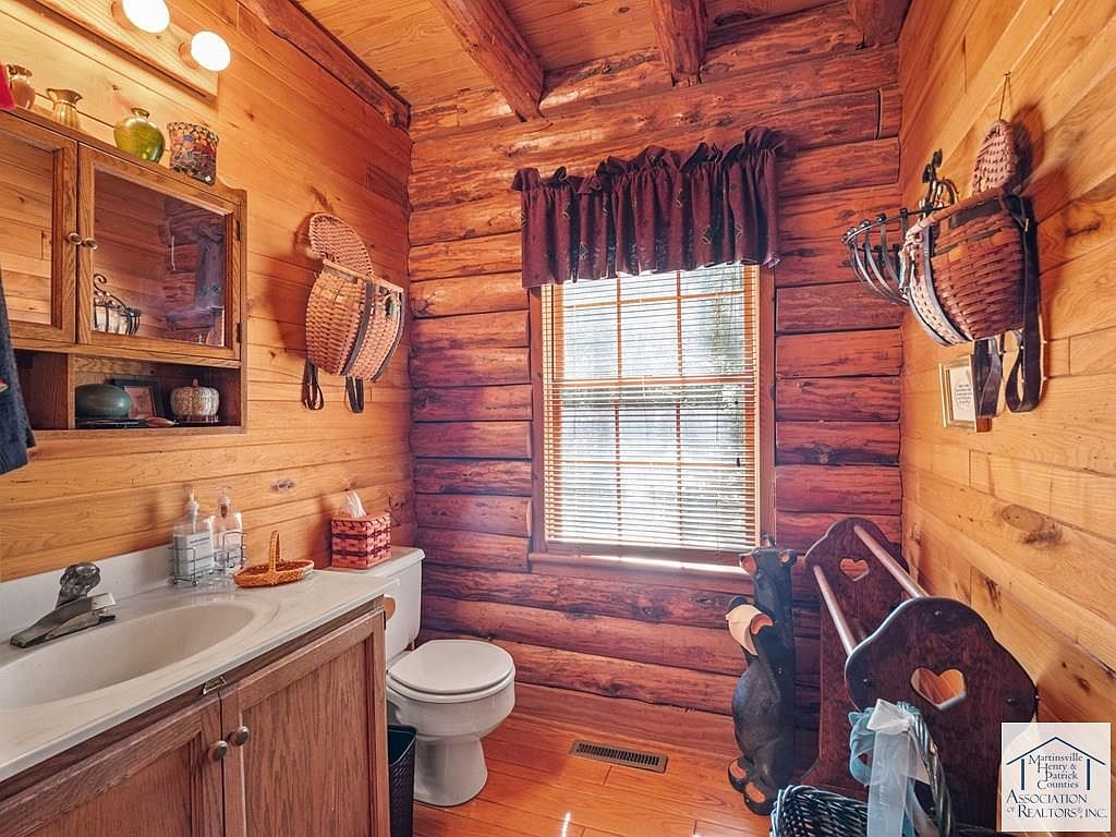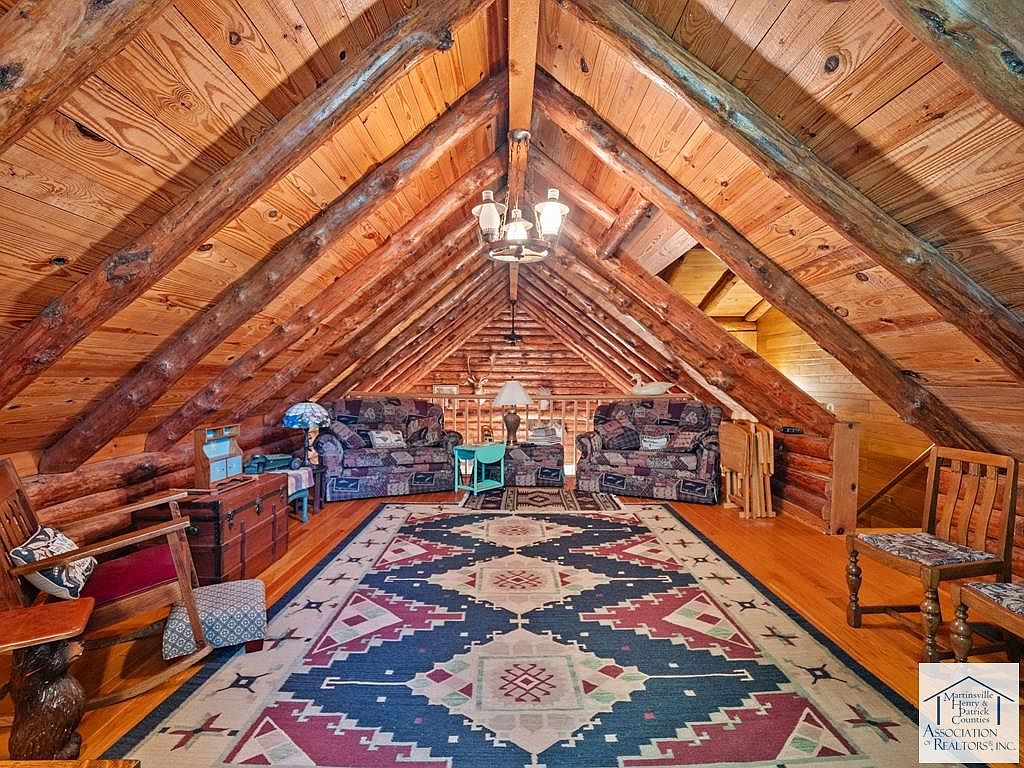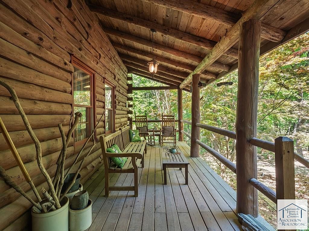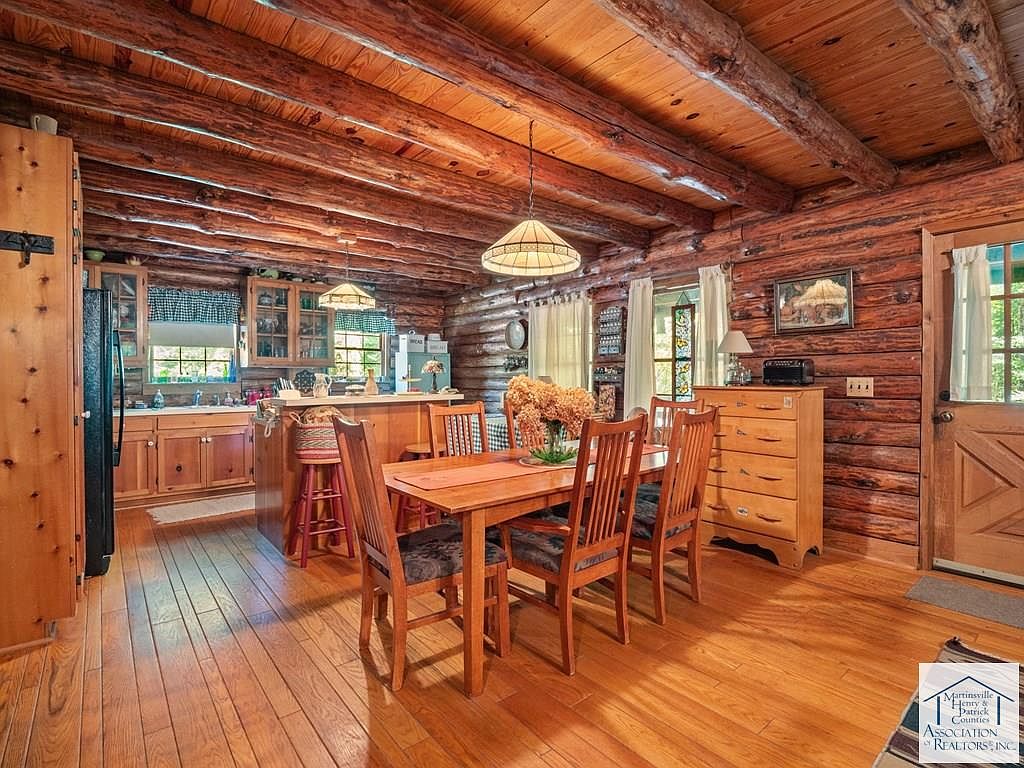 Nestled on 5 acres in Patrick Springs, VA, this charming cabin, listed at $350,000, offers a serene escape with historical significance as a local retreat. Built in the early 20th century, its rustic log architecture showcases cathedral ceilings and hardwood floors, enhancing the warm ambiance. The cabin features three levels, each with a bedroom and full bath, accommodating ample privacy. Recent renovations include a new roof and eco-friendly solar panels, alongside a cozy wood stove and a rock fireplace for winter warmth. Additional amenities comprise a screened gazebo, a mother-in-law suite, and a secret room in the basement, making it a unique, functional retreat perfect for families or investment opportunities.