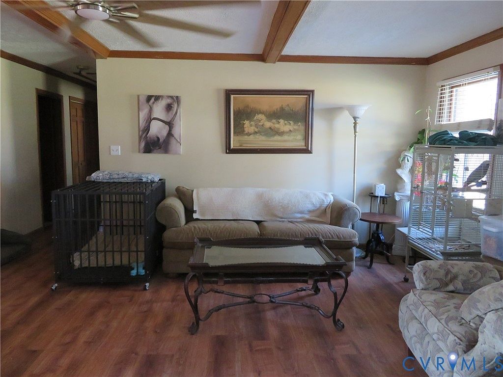 This cozy living room features a blend of comfort and practicality. The color scheme is warm, with light beige walls and rich wood accents from the ceiling beams. A plush sofa is draped with a soft blanket, while a patterned armchair offers additional seating. A glass-top coffee table sits centrally, reflecting natural light. Artwork, including a horse portrait and a serene landscape painting, adorns the walls, adding character. A pet crate is positioned in one corner, indicating a pet-friendly environment. Nearby, a birdcage houses a pet, complemented by a stylish floor lamp, enhancing the room’s inviting atmosphere.
