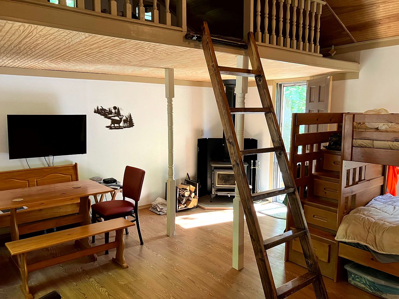 This space features an open layout with warm wooden tones dominating the floor and furniture, creating a cozy atmosphere. A sturdy wooden table with accompanying bench and chair provide a dining area, while a modern television is mounted on the wall opposite. The room is illuminated by natural light through large windows, enhancing the inviting ambiance. A rustic wooden ladder leads to a lofted area, emphasizing the verticality of the room, and a simple bunk bed is positioned to the right, ideal for maximizing space. The decor includes a nature-themed wall art, blending rustic charm with modern comforts.
