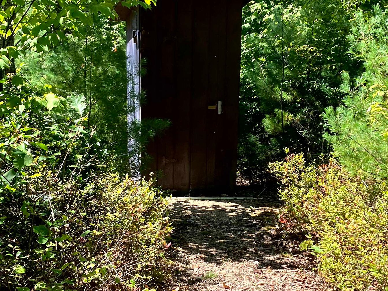 A pathway leads towards a rustic wooden door, partially obscured by vibrant greenery. Lush bushes frame the entrance, displaying a range of colors from deep greens to hints of orange and red. The door itself, made of dark wood, contrasts with the surrounding foliage and is complemented by a simple, modern lock. Soft sunlight filters through the leaves, creating a warm, inviting glow around the entrance. The earthy pathway, lined with scattered gravel and natural textures, enhances the organic feel of the scene, suggesting a tranquil garden space that beckons exploration.