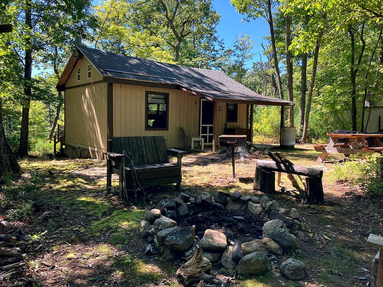 This charming cabin, nestled among lush greenery, showcases a rustic aesthetic. The structure features a light beige exterior with wooden brown trim, blending harmoniously with the surrounding nature. A sloping roof and gabled overhang add to its quaint character. In front, a simple wooden bench invites relaxation near a circular fire pit surrounded by smooth stones, ideal for gatherings. A picnic table sits in the background, enhancing the outdoor entertaining space. Sunlight filters through the trees, illuminating the tranquil setting, creating a warm and inviting atmosphere perfect for a retreat amid the woods.