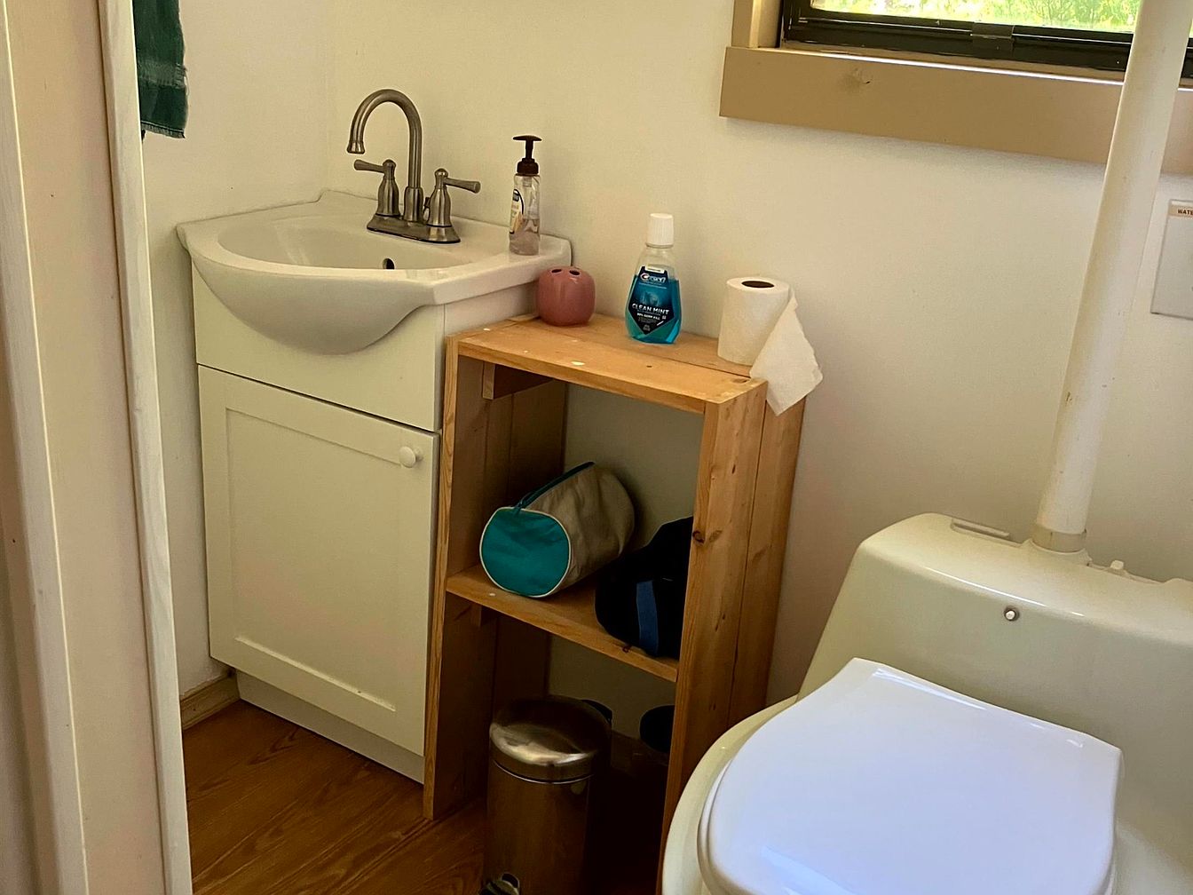 A compact bathroom with a practical yet modern design. The white basin, mounted on a simple cabinet, is paired with a sleek chrome faucet. A wooden storage shelf stands next to the basin, featuring essentials like hand sanitizer, mouthwash, toilet paper, and a small waste bin below. The natural wood tones of the shelf complement the light-colored walls and wooden floor, creating a warm atmosphere. A teal accent bag adds a pop of color, while a window allows natural light to illuminate the space. Functional and minimalist, this bathroom prioritizes utility without sacrificing style.