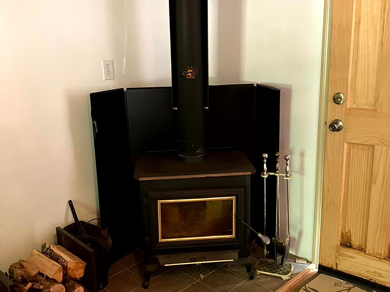 This cozy entryway features a black metal wood stove with a polished gold trim on the front panel, providing warmth and charm. The stove is nestled against a pale wall and flanked by a black heat shield, contrasting nicely with the light color. Next to it, neatly stacked firewood adds a rustic touch, while a metallic log holder enhances functionality. A brass fire tool set stands elegantly beside the stove. The natural wood door to the right introduces an organic element, harmonizing with the earthy tones of the slate flooring, creating an inviting ambiance in this functional space.
