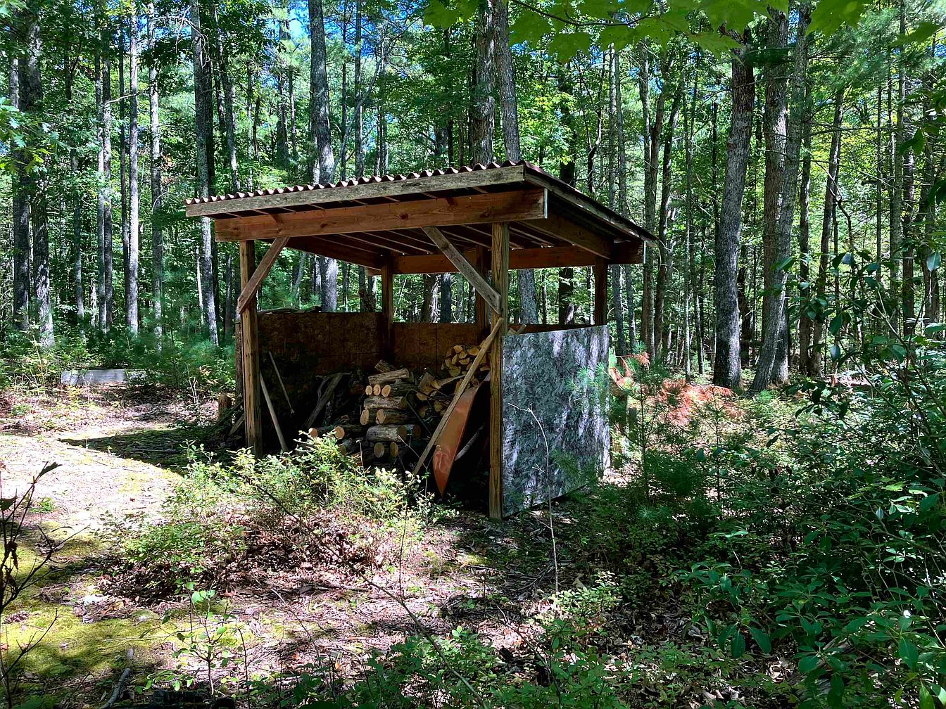 A rustic wood shed stands amidst a vibrant forest, showcasing natural aesthetics. The structure features a wooden frame with a corrugated metal roof, providing shelter. Stacked logs fill the open area on one side, hinting at practical use for firewood storage. Surrounding greenery, including shrubs and moss, adds depth and warmth to the scene. Sunlight filters through tall trees, illuminating the shed and casting gentle shadows. The earthy tones of wood blend harmoniously with the lush foliage, accentuating the shed’s functional yet inviting character. This outdoor storage area complements the serene, woodland environment perfectly.