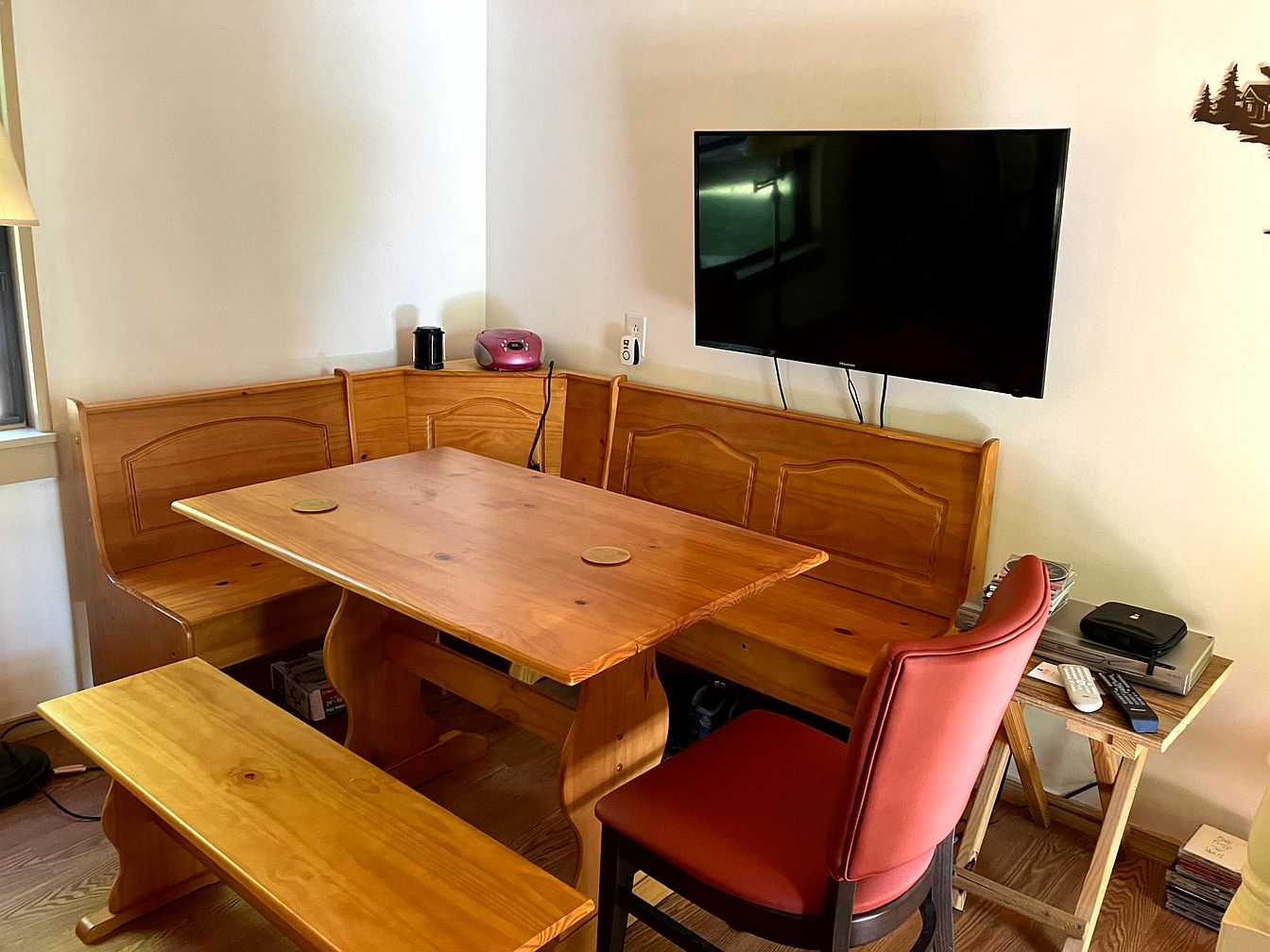This cozy dining nook features a solid wooden bench-style seating arrangement, accommodating several diners around a matching table. The warm honey-toned wood creates a welcoming atmosphere, complemented by a rich red chair that adds a touch of elegance. A flat-screen television mounted on the wall enhances usability, suggesting a multi-functional space ideal for casual dining or family gatherings. The clean lines of the furniture harmonize with the light walls, while a window admits natural light, brightening the area. Simple décor accents, including a small table with remote controls and decorative elements, emphasize convenience and comfort.