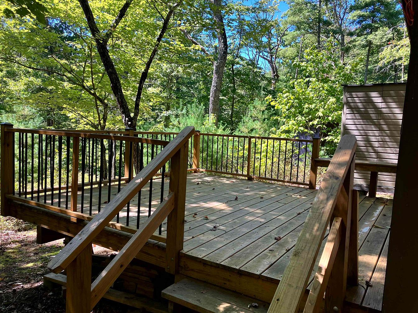 This image showcases a wooden deck extending from a modest one-story house, framed by lush greenery. The deck features a natural wooden railing, combining warm tones of timber with black metal balusters for contrast, enhancing safety and aesthetics. The house’s exterior wall consists of beige siding, complemented by dark trim around windows and doors. A steeply pitched roof provides texture, while a small, functional shed stands off to the side. Sunlight filters through the trees, casting dappled shadows, creating a serene atmosphere. The layout feels inviting, suggesting a perfect spot for outdoor relaxation or gatherings.