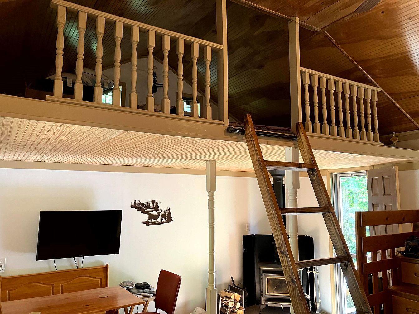 This space features a cozy loft area elevated above the main room, accessible by a rustic wooden ladder. The balustrade surrounding the loft adds a charming touch, with a light beige color complementing the warm tones of the wooden ceiling and floor. Below, the main area includes a simple wooden table paired with a single chair, providing a functional eating or working space. A flat-screen television is mounted on the wall opposite, enhancing the contemporary feel. Natural light filters in through large windows, highlighting a decorative wall piece showcasing a nature-inspired silhouette, enhancing the overall rustic aesthetic.
