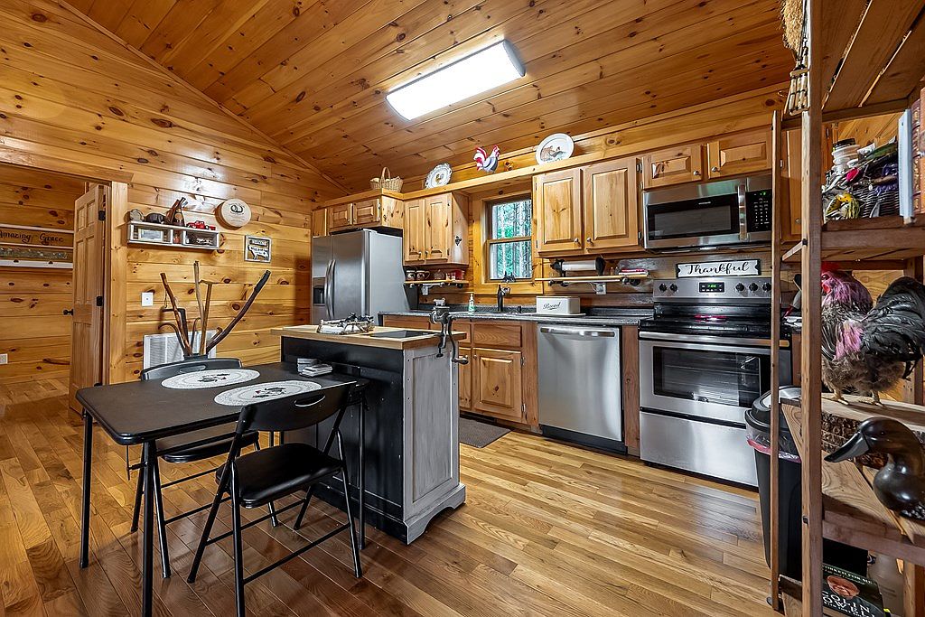 This cozy kitchen features warm wooden paneling and cabinetry, creating a rustic yet inviting atmosphere. The floor is adorned with polished hardwood, enhancing the natural feel. Stainless steel appliances, including a refrigerator and an oven, complement the wood tones beautifully. A small black dining table with chairs offers a space for meals or casual gatherings. Decorative elements like plates and a thankfulness sign add personal touches to the space. A window allows natural light to flow in, highlighting the textures of wood and metal while providing a view of the surrounding area. Overall, it embodies charm and functionality.
