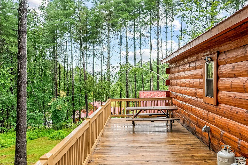 This image showcases a spacious outdoor deck attached to a log cabin-style home. The deck features natural wood railings and a picnic table, inviting outdoor gatherings. The warm tones of the wooden logs contrast beautifully with a bright red metal roof, enhancing the rustic charm. Lush greenery surrounds the area, with tall trees and grassy patches adding to the tranquil ambiance. A gas grill and other amenities suggest a functional outdoor living space, perfect for entertaining. The overall aesthetic reflects a harmonious blend of natural materials and a welcoming atmosphere for relaxation and enjoyment.