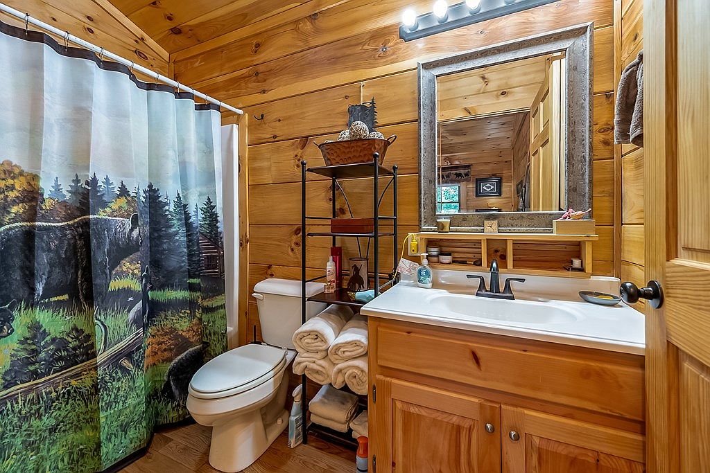 This cozy bathroom features warm wooden walls and a rustic aesthetic. The shower curtain showcases a scenic wilderness design, depicting a bear and surrounding trees. A white countertop contrasts with the natural wood cabinetry beneath it, providing ample storage space. The sleek sink and modern faucet add a contemporary touch. A set of neatly rolled towels sits beside the toilet, enhancing the room’s inviting feel. A stood metal shelf holds toiletries and decorative items, while a large mirror with a textured frame reflects the soft lighting overhead, creating a warm and welcoming ambiance throughout the space.