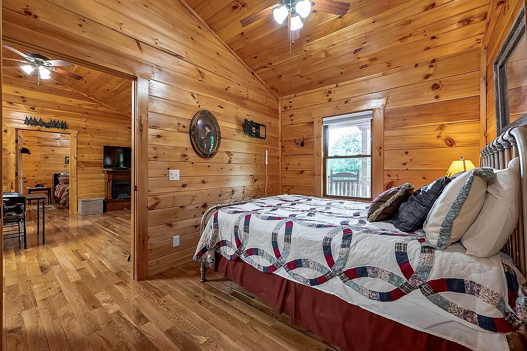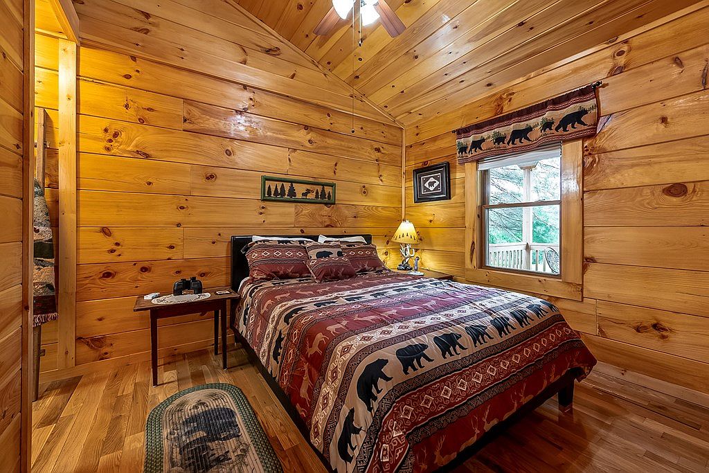 A charming bedroom showcasing natural wood paneling that envelops the space, promoting a rustic vibe. The warm tones of the pine wood walls create an inviting atmosphere. A comfortable bed, adorned with a patterned quilt featuring bears and foliage, serves as the centerpiece. On one side of the bed, a sleek wooden nightstand holds a lamp, adding to the warm glow. A window with wooden trim offers views of the outdoors, enhancing the room’s tranquility. Decorative elements, like framed artwork and a small rug with wildlife motifs, complement the country aesthetic, creating a harmonious retreat.