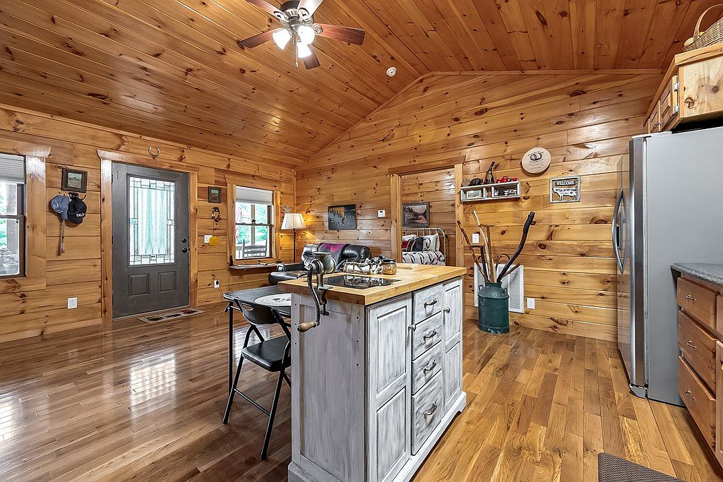 This cozy kitchen features an open layout with warm, natural wood paneling that gives a rustic charm. The polished hardwood floor reflects the abundant light coming through the windows, enhancing the inviting ambiance. A central island with a distressed white finish contrasts beautifully with the sleek granite countertop. Surrounding cabinetry is made of rich timber, adding richness to the space. A ceiling fan offers functionality while complementing the traditional aesthetic. Decor elements like a hat rack and wall art portray a personal touch, creating a balance between practical and decorative features in this welcoming area.