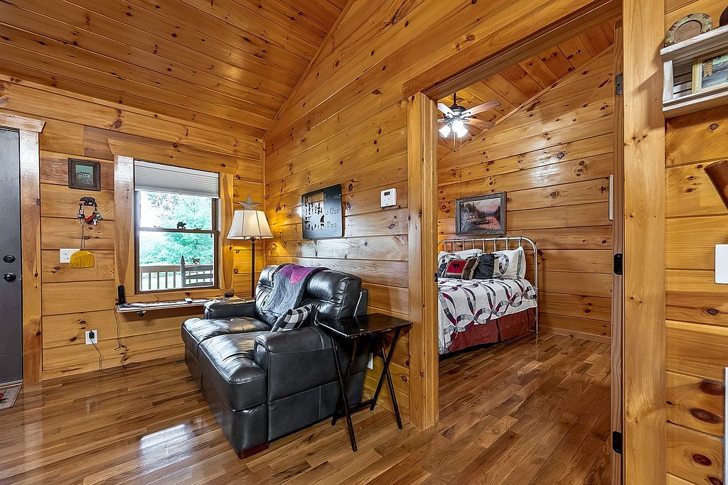 This space features warm wood paneling, creating a rustic and inviting atmosphere. A black leather loveseat is positioned in front of a window, complemented by a stylish floor lamp, illuminating the area with soft light. The hardwood floor enhances the cozy feel while a small table provides a functional touch. To the right, a doorway reveals a neatly made bed adorned with a patterned quilt and decorative pillows, adding a pop of color. A mounted artwork on the wall introduces an artistic element, and a ceiling fan offers comfort, tying together the room’s charming aesthetic.