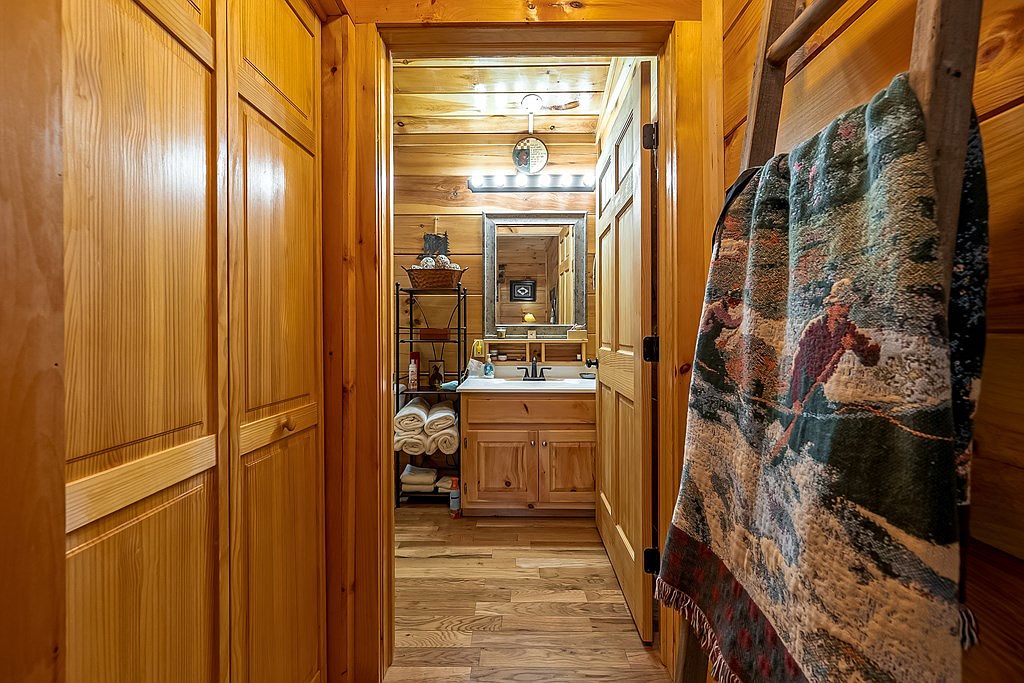 The space features a warm wooden interior with natural pine paneling throughout, creating a cozy and rustic ambiance. To the left, closed wooden doors suggest storage options, while directly ahead, a polished wooden vanity reflects soft lighting from overhead fixtures. A small shelf holds white rolled towels, adding a touch of spa-like comfort. The floor is adorned with rich hardwood, enhancing the welcoming feel. A colorful towel hangs from a ladder, depicting a fishing scene, contributing charm and personality. Light bounces off the wood surfaces, making the space feel open yet intimate, ideal for relaxation.