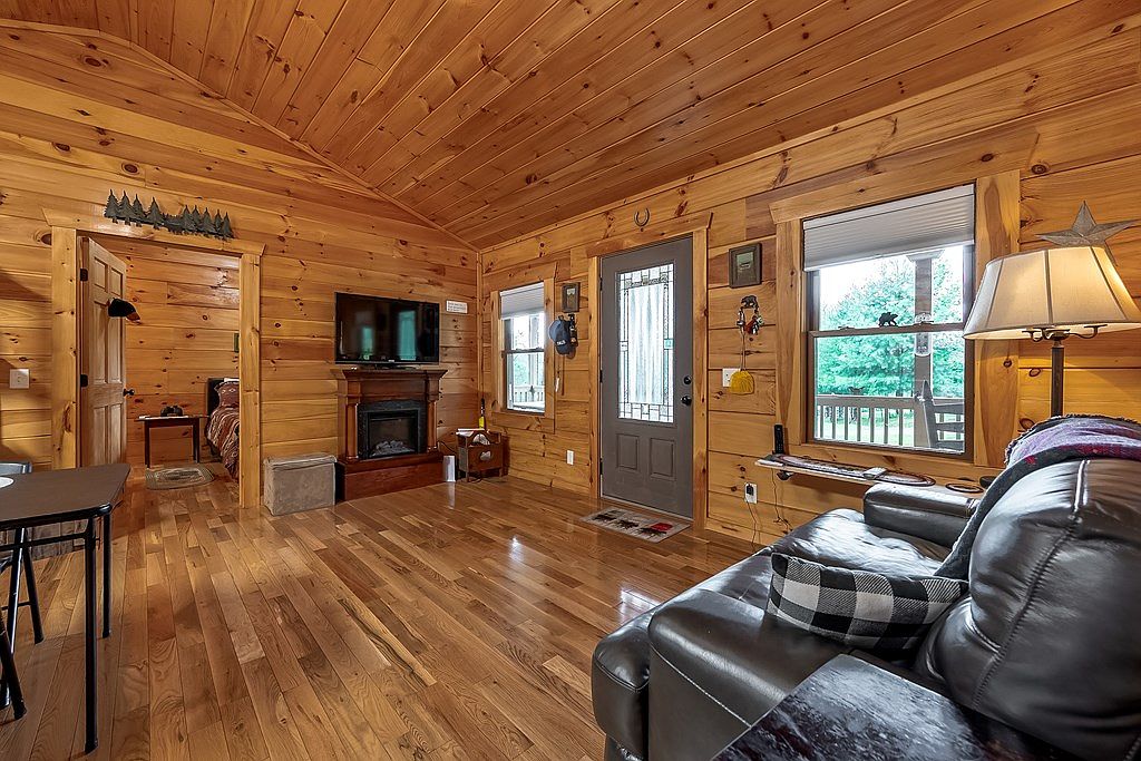 The living room showcases a cozy and rustic ambiance, characterized by warm wooden walls and ceilings that enhance the cabin feel. A plush black leather sofa invites relaxation, paired with a decorative throw and accent pillows featuring a checkered pattern. A coffee table sits nearby on polished hardwood flooring, reflecting a natural aesthetic. The room features a functional fireplace below a wall-mounted television, adding to the comfort. Natural light filters through windows adorned with simple treatments, illuminating the space, while a glass-paneled front door introduces the outside. Decorative elements provide subtle charm, completing the inviting atmosphere.