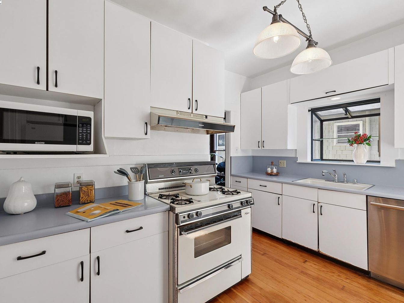 Clean lines and a classic mid-century feel are featured in this kitchen, with crisp white cabinetry and matte black handles providing a bright, fresh look. Light blue countertops contrast subtly with the warm wood flooring, adding softness to the space. A vintage gas range and matching stainless steel vent evoke a historic charm, flanked by modern conveniences such as a built-in microwave and a stainless steel dishwasher. Above, twin pendant lights with glass shades offer a gentle, inviting glow. Near the window, a white vase with vibrant flowers and simple canisters add a touch of personality to the practical arrangement.