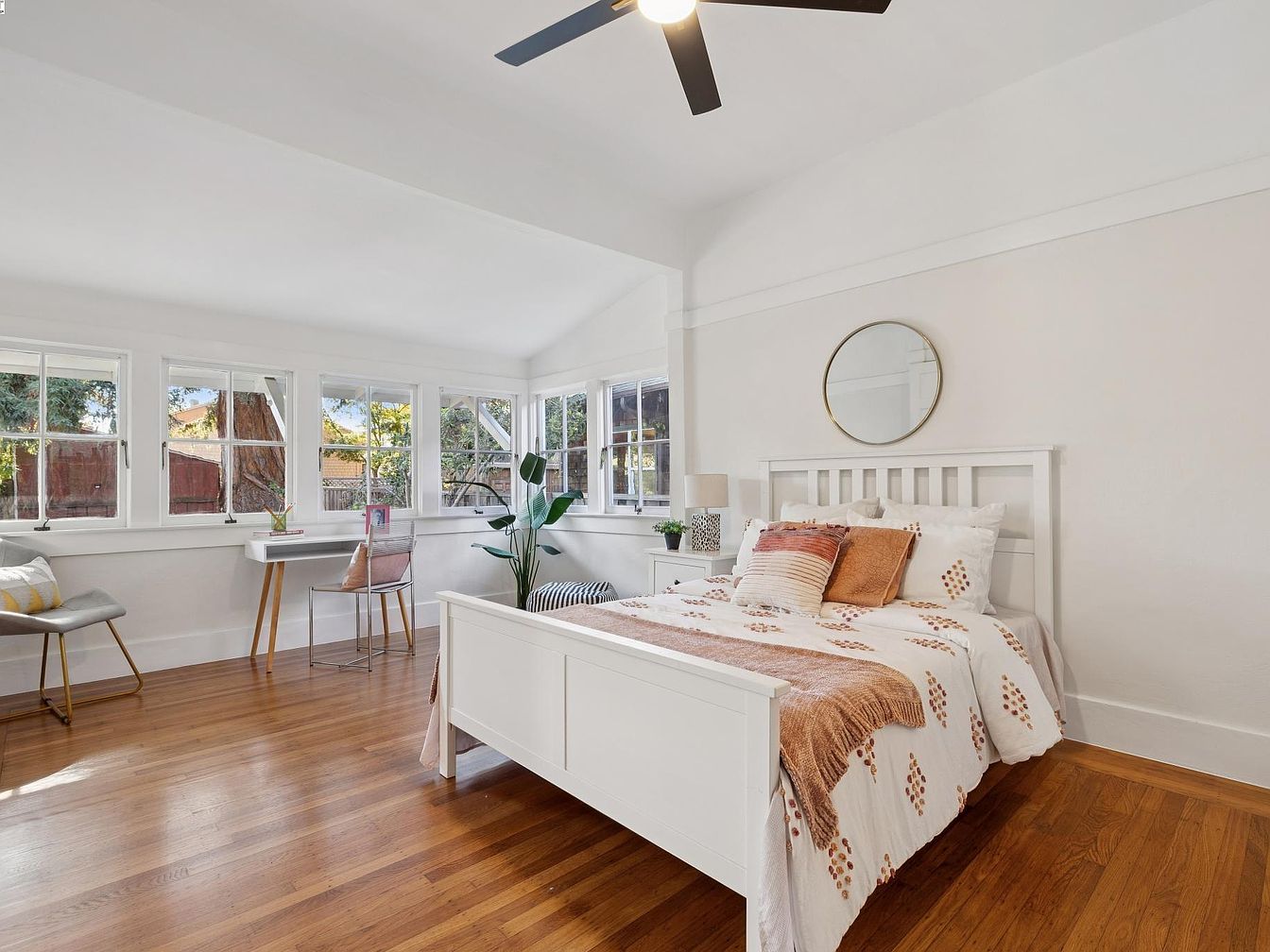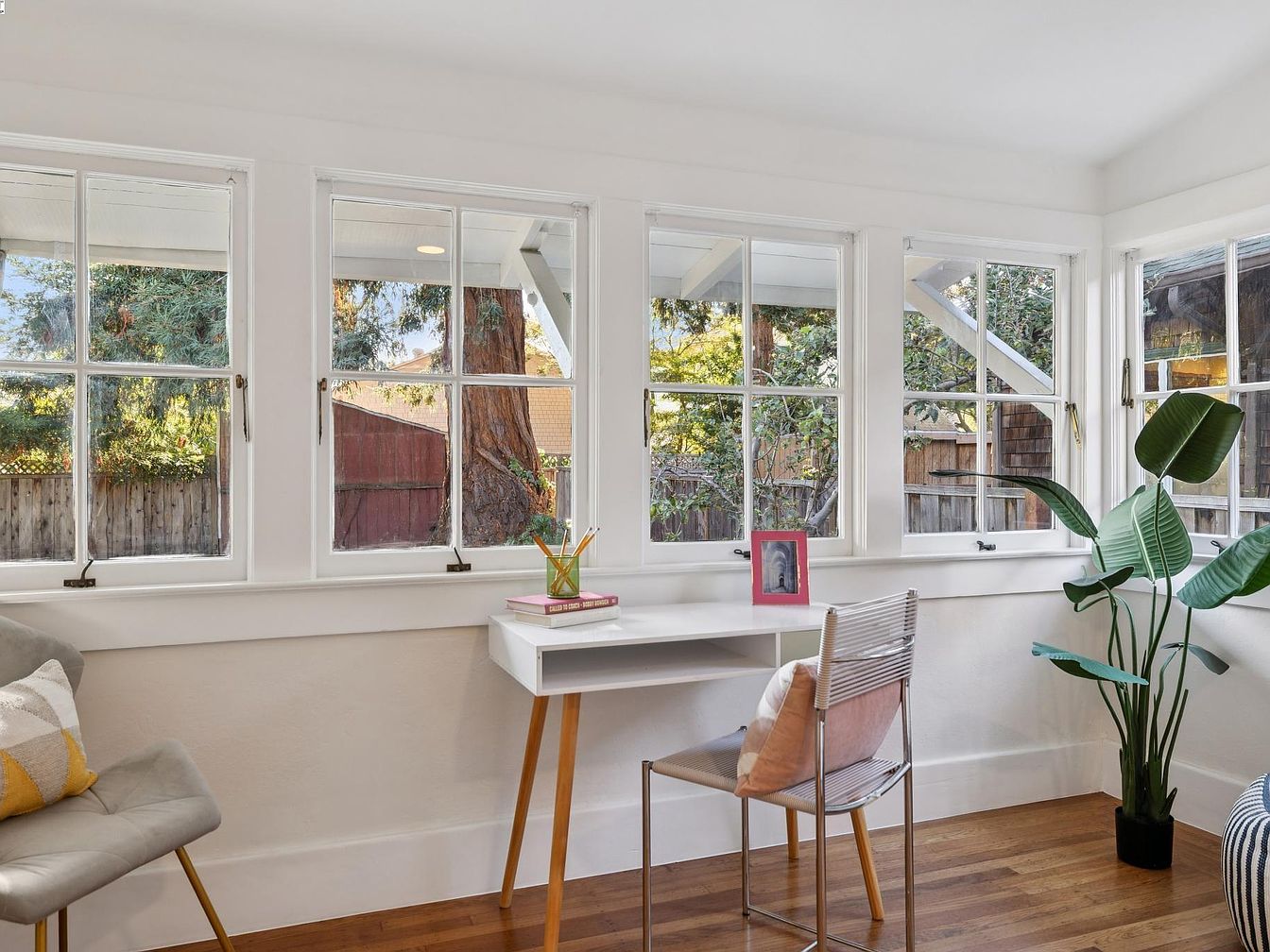 A small corner workspace set by five large multi-pane windows, filling the room with natural light. The windows have white trim and overlook a fenced backyard with trees. A simple white desk with slim wooden legs holds a few books, a framed photo, and a glass jar of pencils. Nearby, a chair with a blush cushion is paired with the desk, while a modern gray accent chair with a yellow and white pillow sits to the left. A tall green indoor plant in the corner adds freshness, and honey-colored wood floors and white walls create a bright, airy atmosphere.