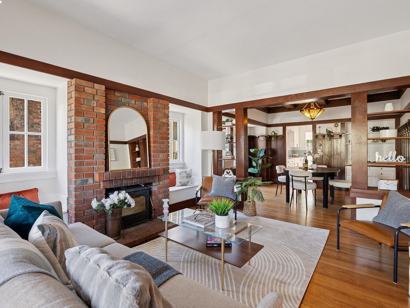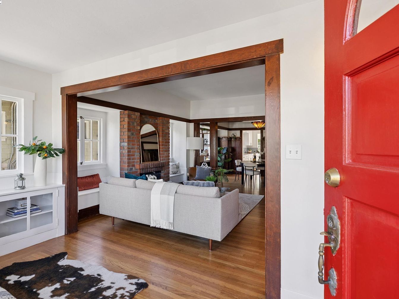 A bold red front door opens to a welcoming space with honey-toned hardwood floors and prominent dark-wood trim framing the entryway. The living room features a mid-century modern light gray sectional sofa adorned with a white throw. Directly ahead, a rustic brick fireplace with a large arched mirror above becomes the room’s focal point. Accents like a cowhide rug and built-in shelving beneath front-facing windows add warmth and character. Hints of the dining area can be glimpsed beyond, continuing the open-concept flow, while abundant natural light illuminates the bright, neutral walls and period architectural elements.