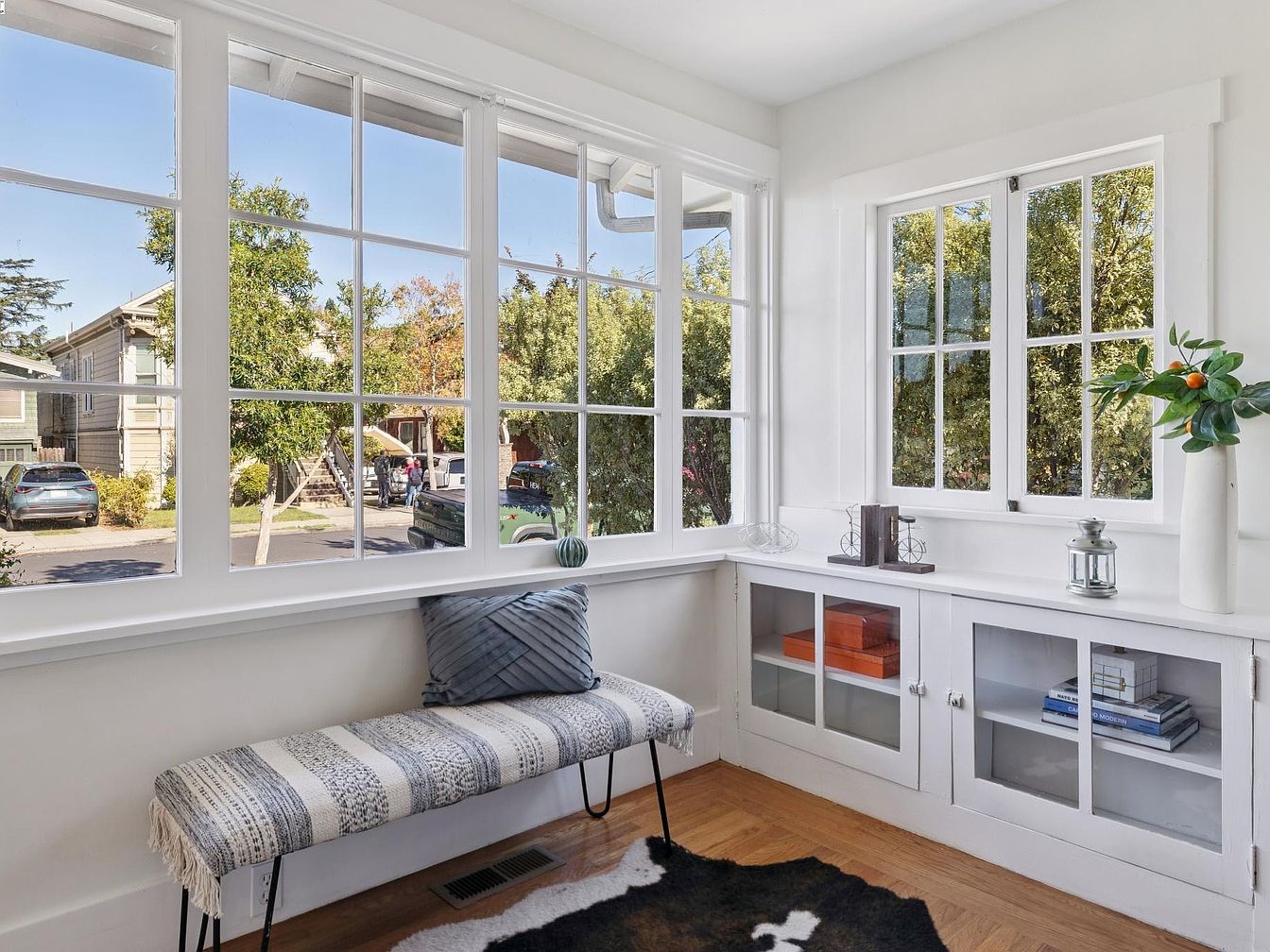 A bright corner space filled with natural light streaming through large, multi-paned windows on two adjacent walls, offering clear views of a quiet residential street and lush greenery. The walls and window trim are painted white, contributing to a crisp, fresh atmosphere. A cozy upholstered bench with a gray and white pattern and a soft accent pillow sits below the central window. Built-in cabinetry with glass-front doors runs along the wall beneath the side window, housing neatly arranged books, a vibrant orange box, and simple decorative objects. A small white vase with an arrangement of greenery adds color and charm, while a glossy wood floor and part of a cowhide rug complete the inviting scene.
