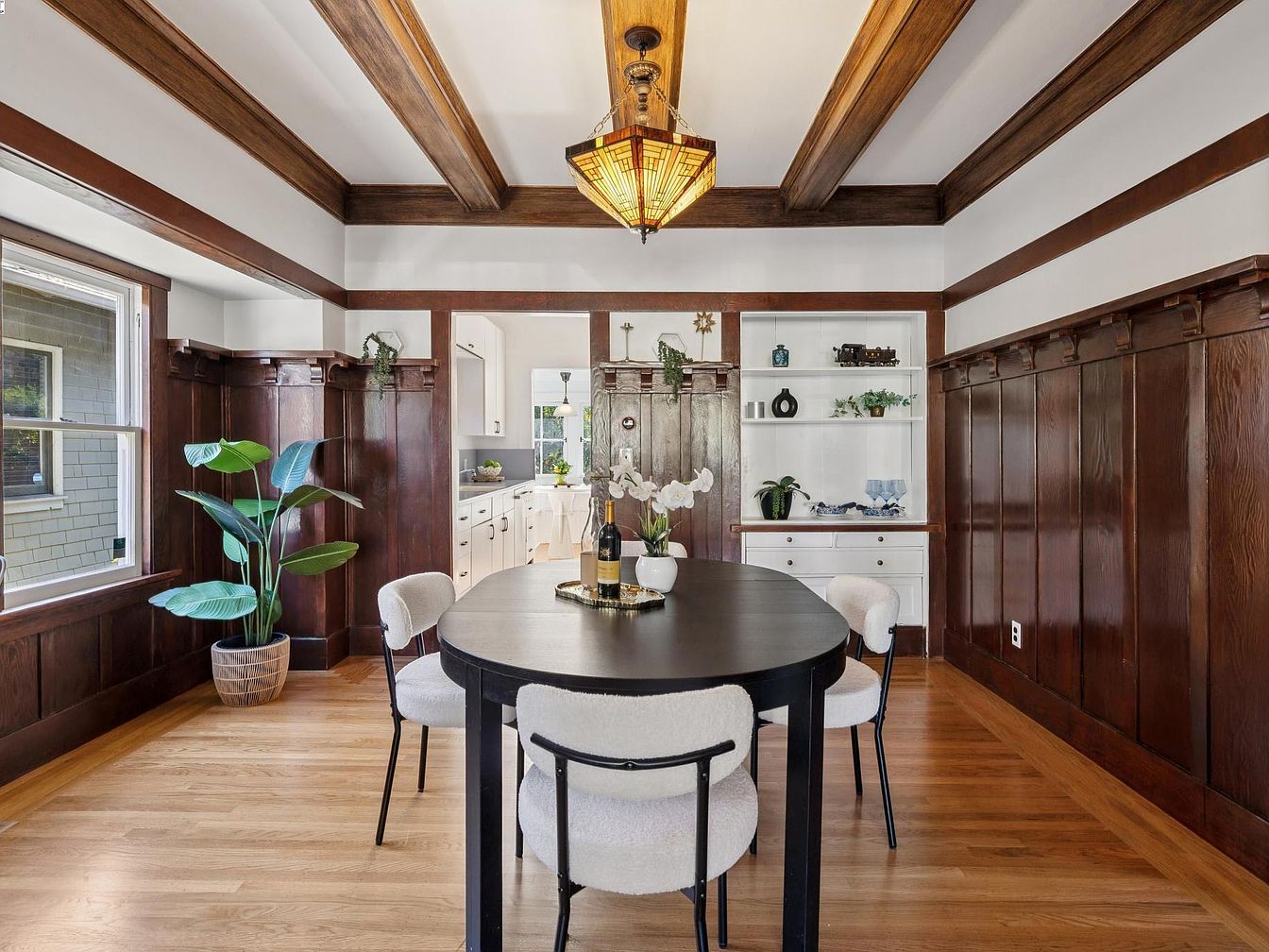 Warm and inviting dining space with Craftsman-style wood paneling running halfway up the walls, paired with crisp white paint above for contrast. The ceiling features exposed wooden beams and a stained glass pendant light in warm amber tones. The polished wood floor complements the darker wood panels. Four white boucle-upholstered chairs surround a dark oval dining table set with flowers and wine, creating a cozy, elegant atmosphere. A large window to the left brings in natural light, while potted greenery adds freshness. At the far end, built-in white shelves display delicate glassware and decorative objects, enhancing the period charm.