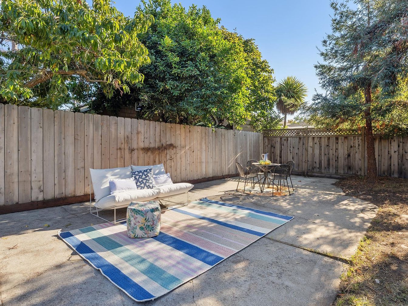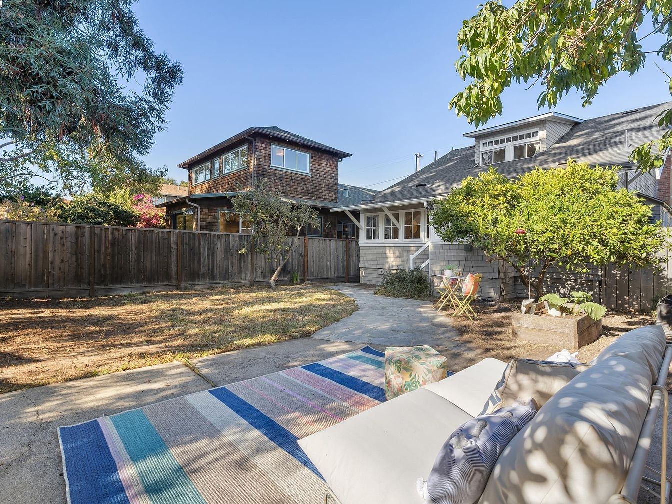 A serene backyard with mature trees and a wooden privacy fence. A light-colored outdoor sofa sits on a large striped area rug, creating a cozy lounge zone. Bright patio chairs and a small table are set up near the house for outdoor dining, while a raised planting bed with lush greenery adds life to the space. The house exterior combines weathered wooden siding and craftsman-style architectural details with white trim. Natural sunlight fills the area, highlighting a harmonious mix of neutral tones and pops of color, emphasizing relaxation and the welcoming, homey feel of a historic property’s backyard oasis.