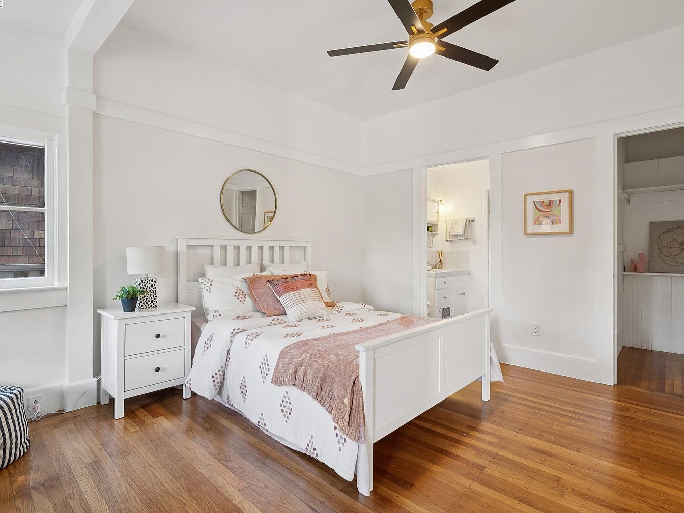 A cozy bedroom features a white wooden bed with a geometric-patterned comforter in soft cream and pale pink tones, accented by textured throw pillows. To the left of the bed, a small white nightstand holds a modern table lamp with a perforated ceramic base and a green potted plant. Above the bed, a round gold-framed mirror complements the minimalist decor. The room has warm, honey-toned hardwood flooring and crisp white walls, enhancing the airy feel. An open doorway leads into a private bathroom, and another doorway reveals a closet area with shelving and additional wall art, adding subtle charm and functionality.
