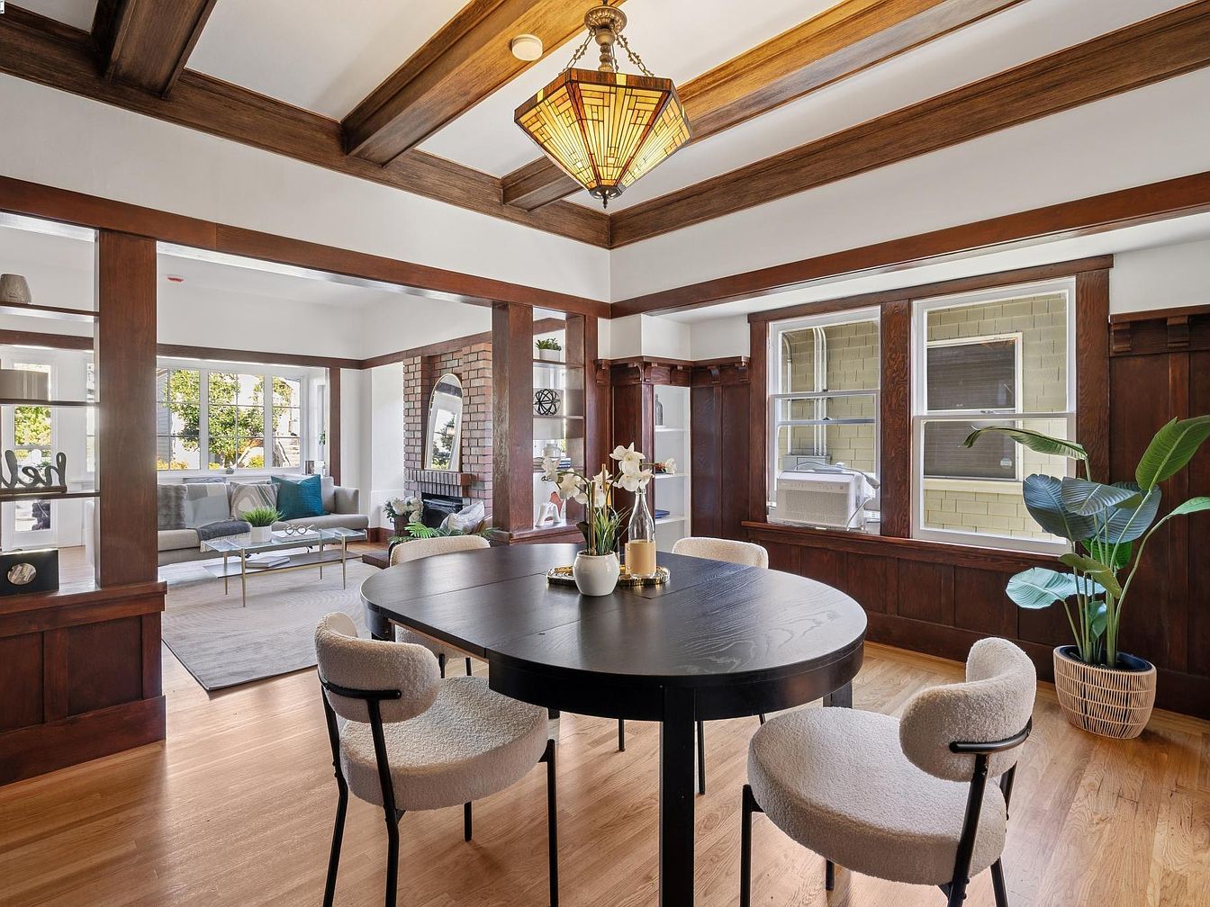 A spacious dining area with prominent historic features, including rich wood wainscoting and exposed ceiling beams in a dark finish. Light hardwood floors contrast with the darker trim, adding warmth and depth. A round black modern dining table anchors the space, surrounded by four cream upholstered chairs with minimalist metal legs. The windows along one wall bring in abundant natural light, highlighting a tall potted plant in a woven basket. In the background, an adjacent living space is visible, featuring a brick fireplace, large arched mirror, and built-in shelving. The overall aesthetic blends craftsman architectural details with contemporary furnishings.